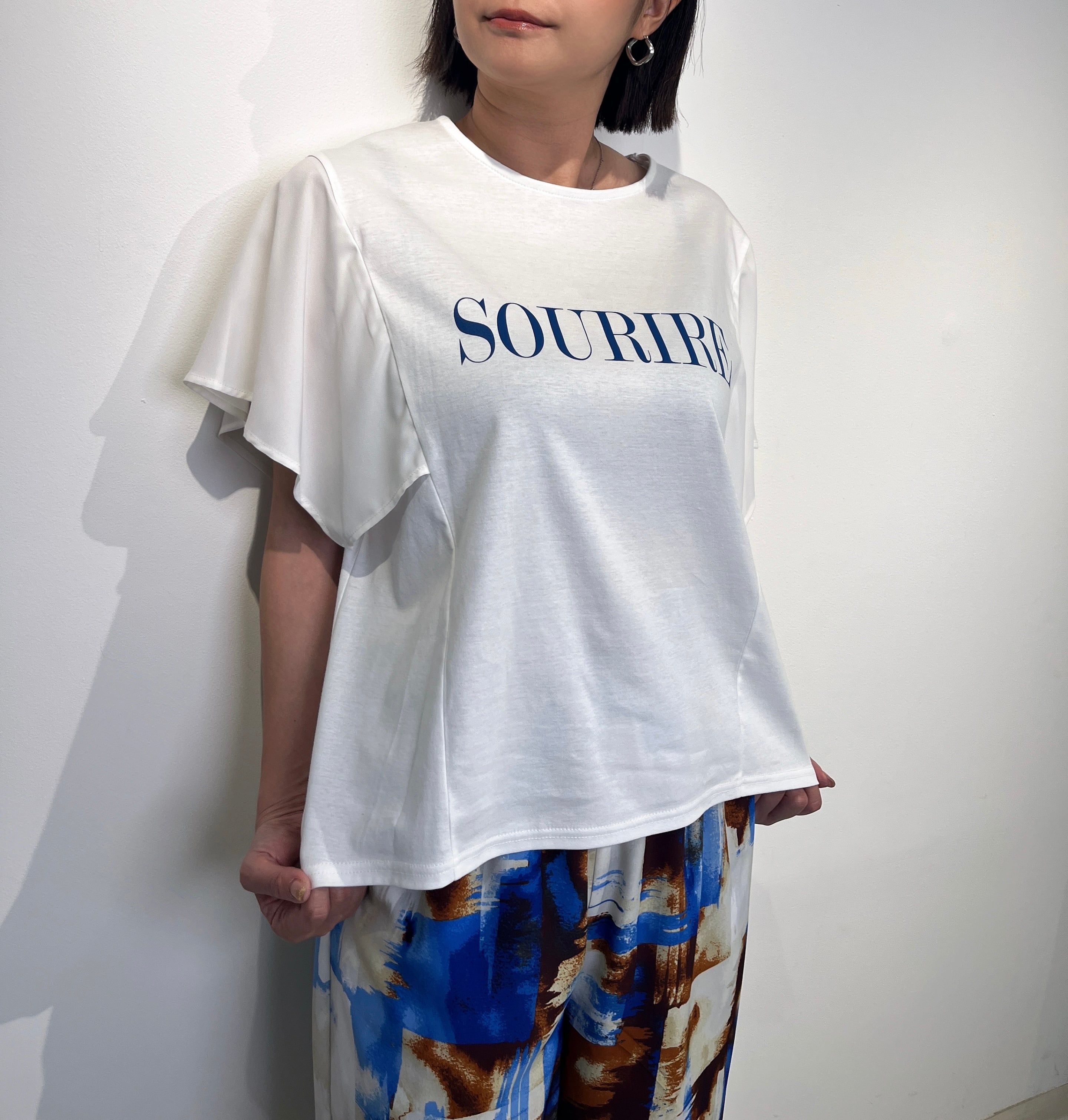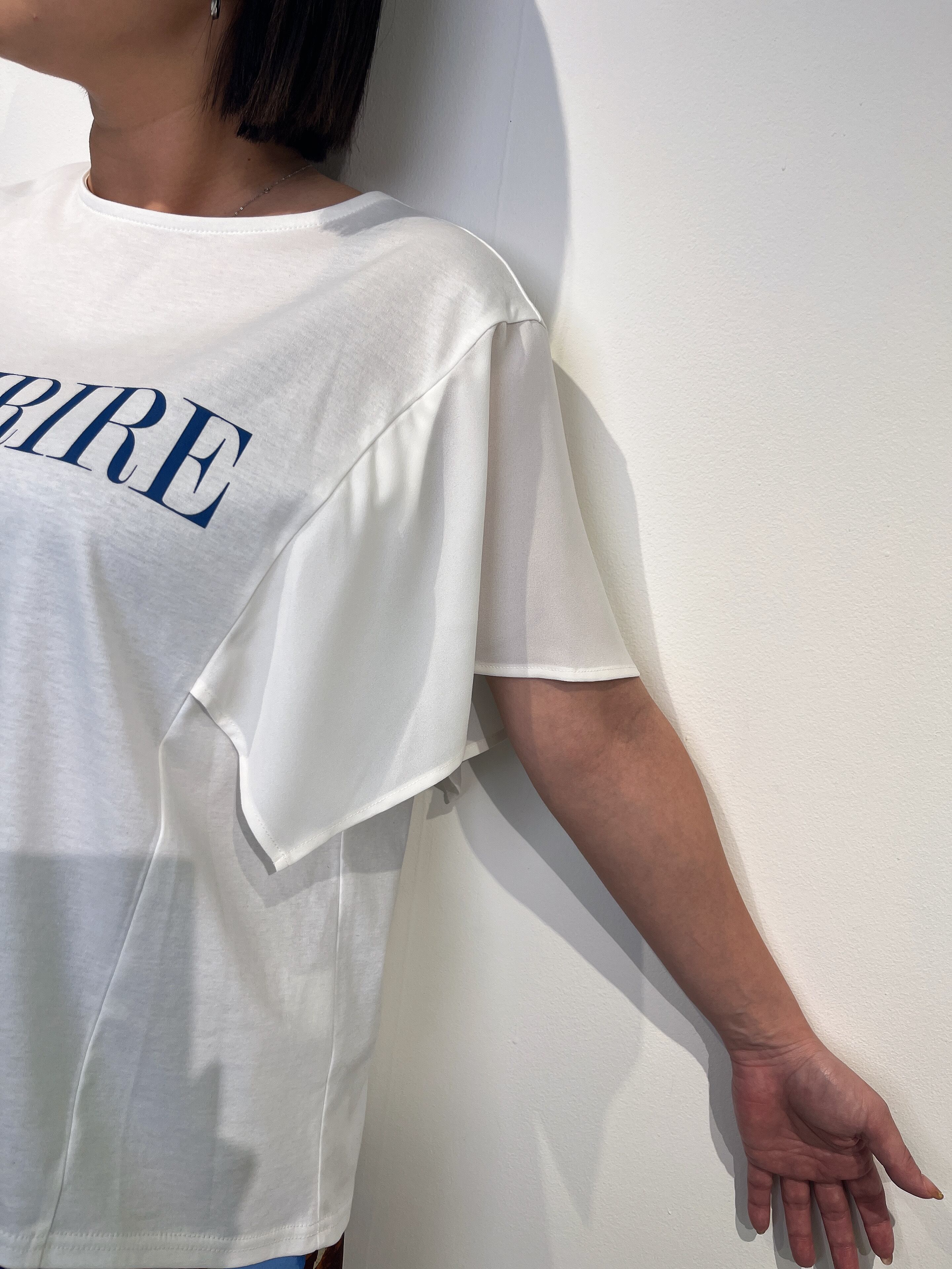 袖部分は柔らかいジョーゼットで切り替えておりシアー感がありながら二の腕をカバーしてくれる、スタイリングしやすいトップスです。