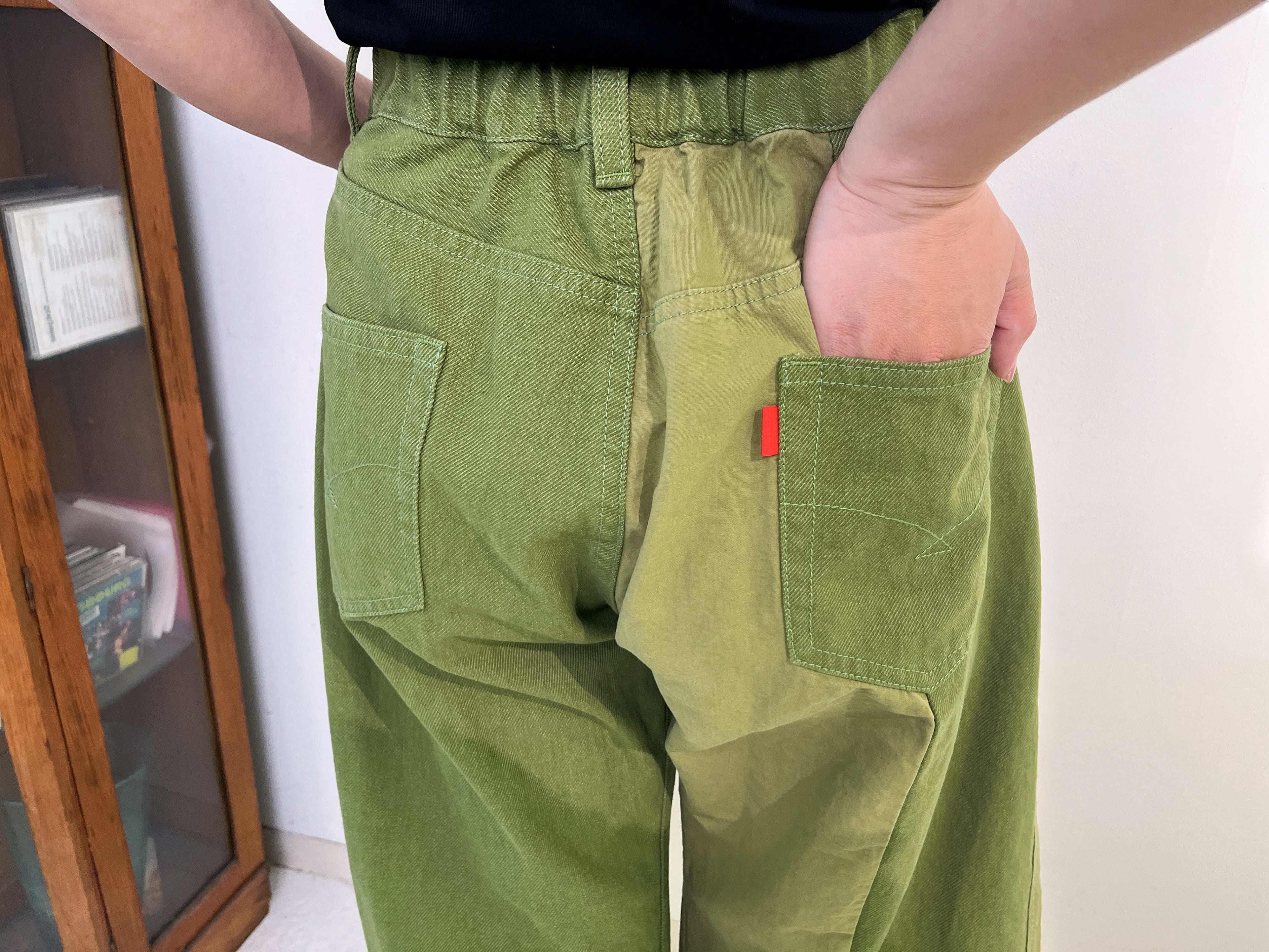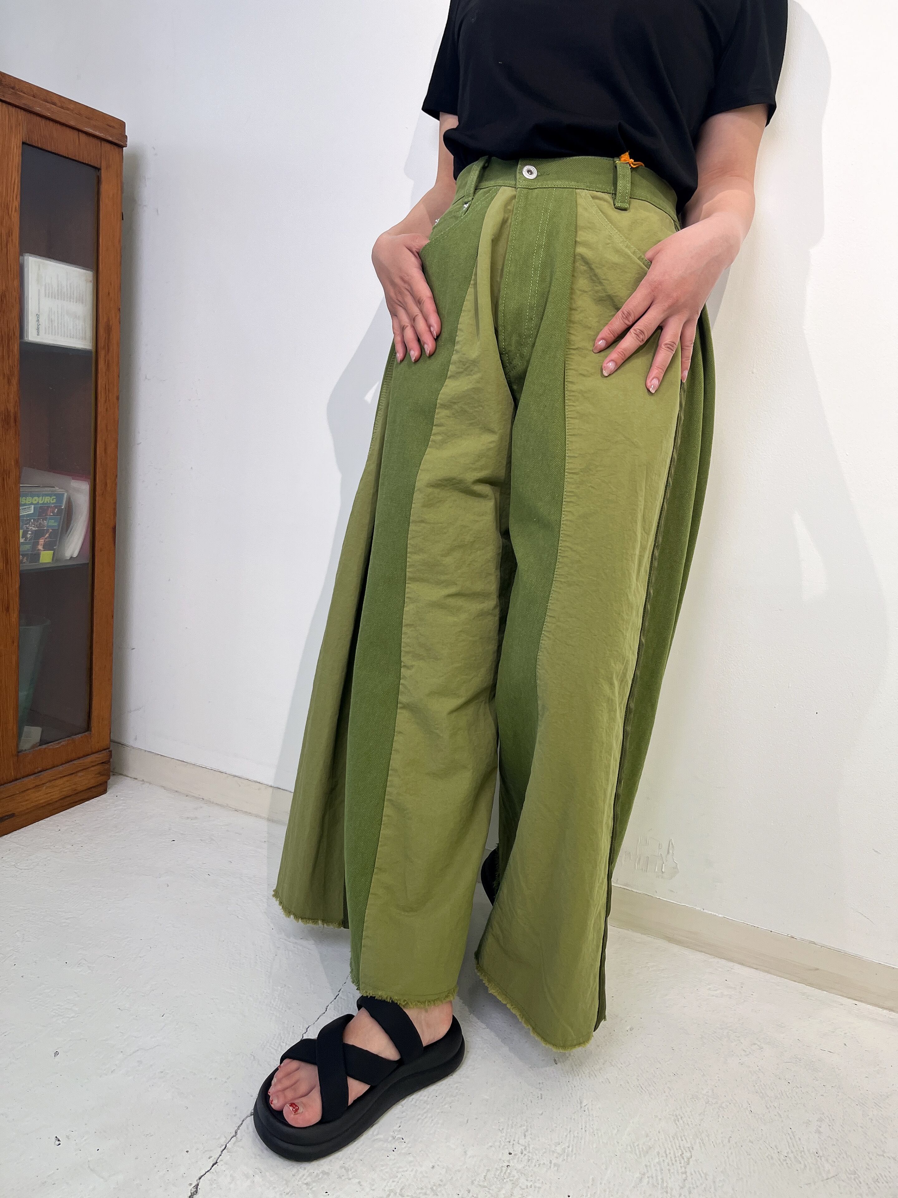 ウエスト部分から裾にかけての切り替えデザインが、スタイルを引き立てるワイドパンツです。