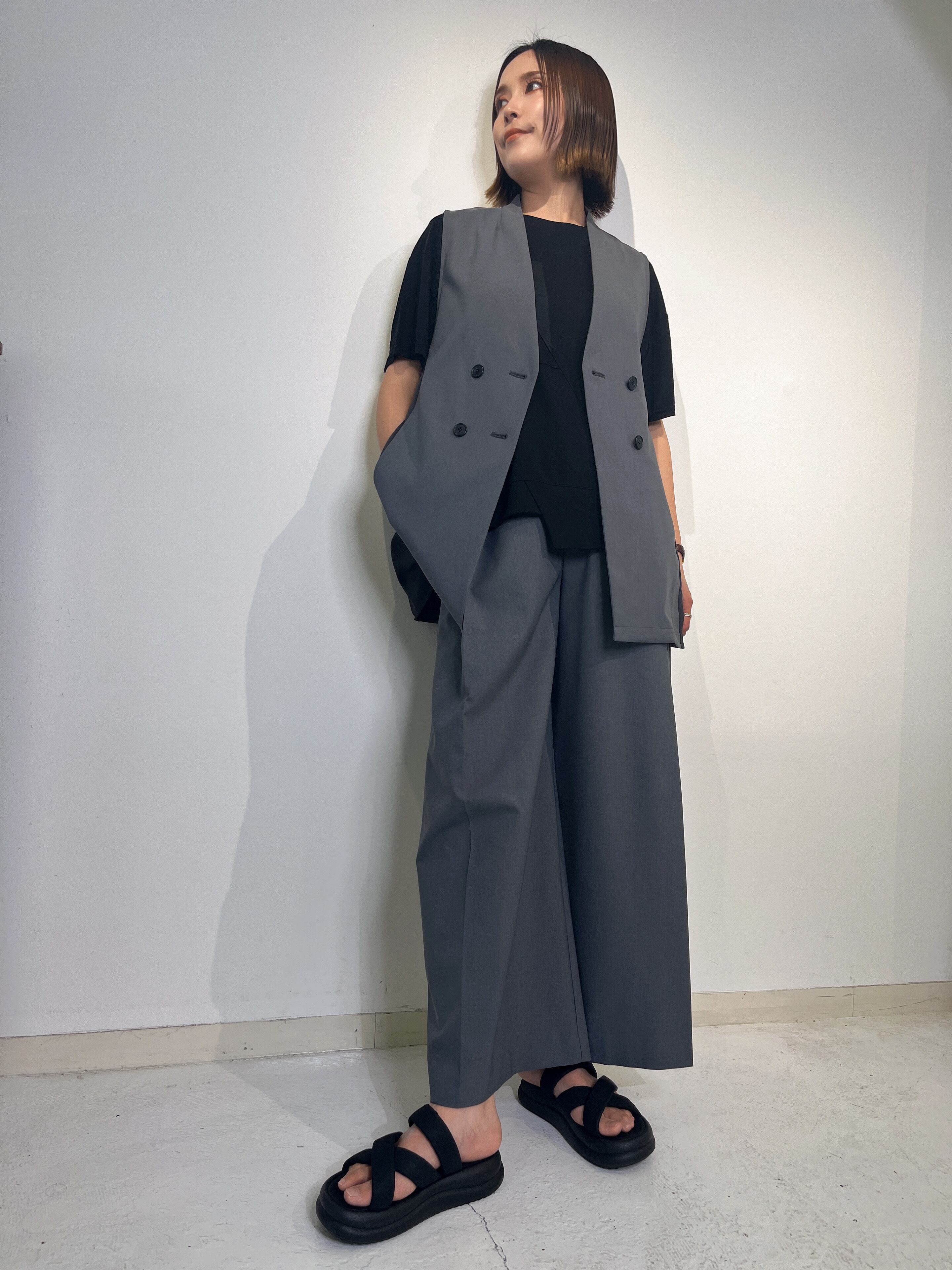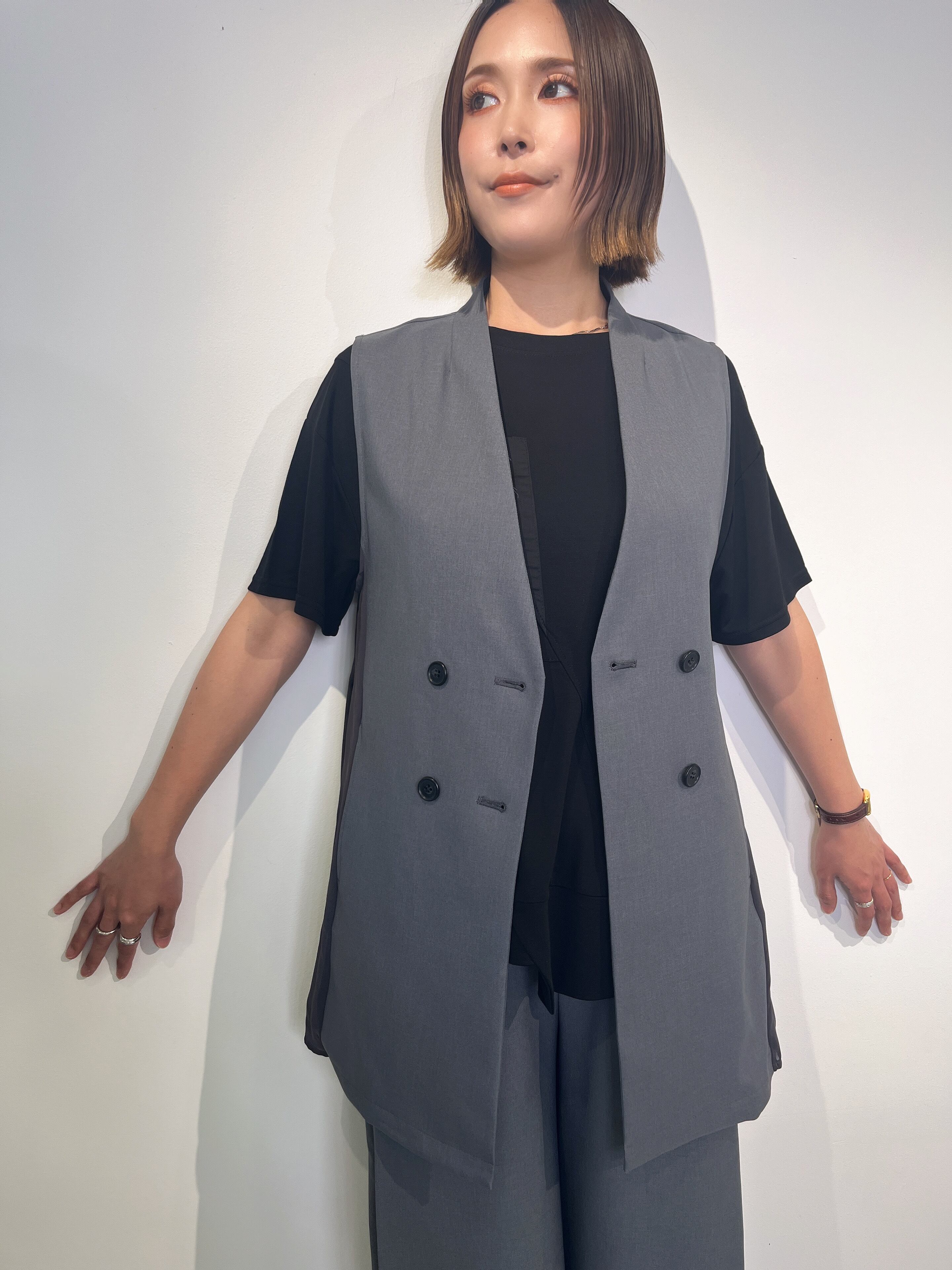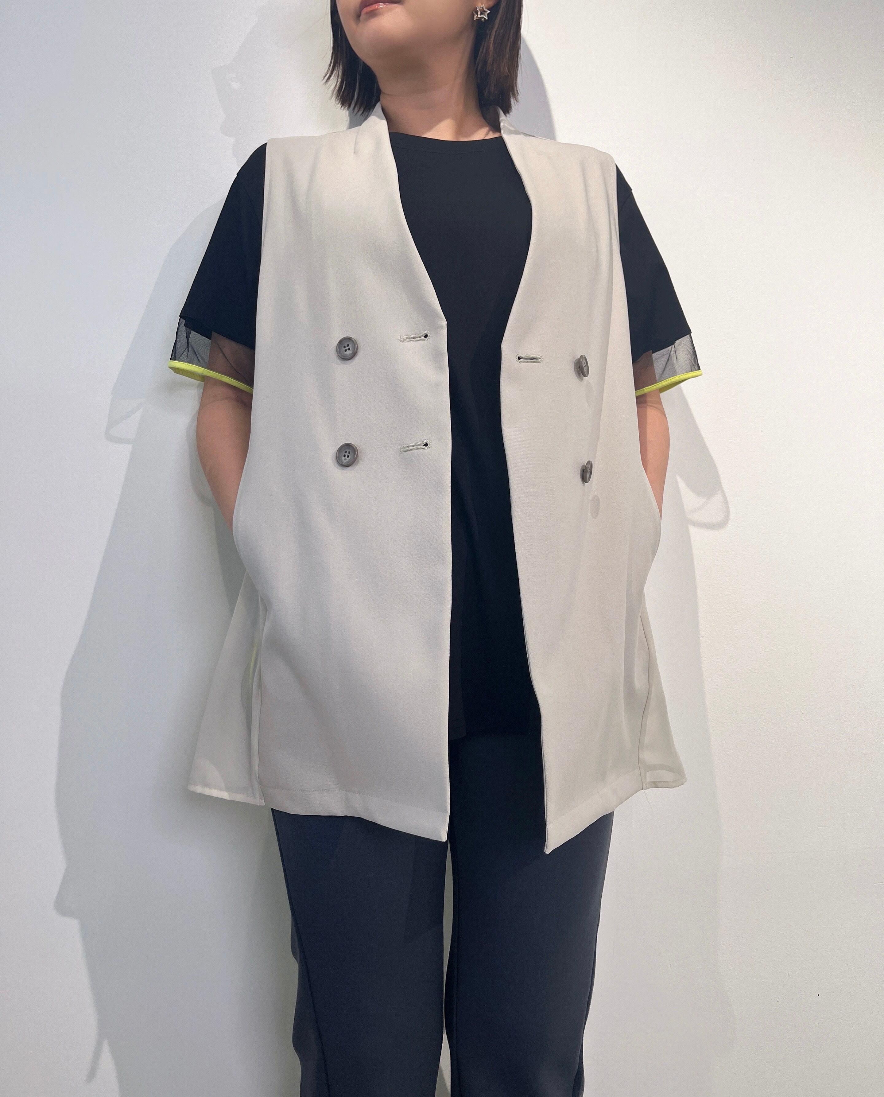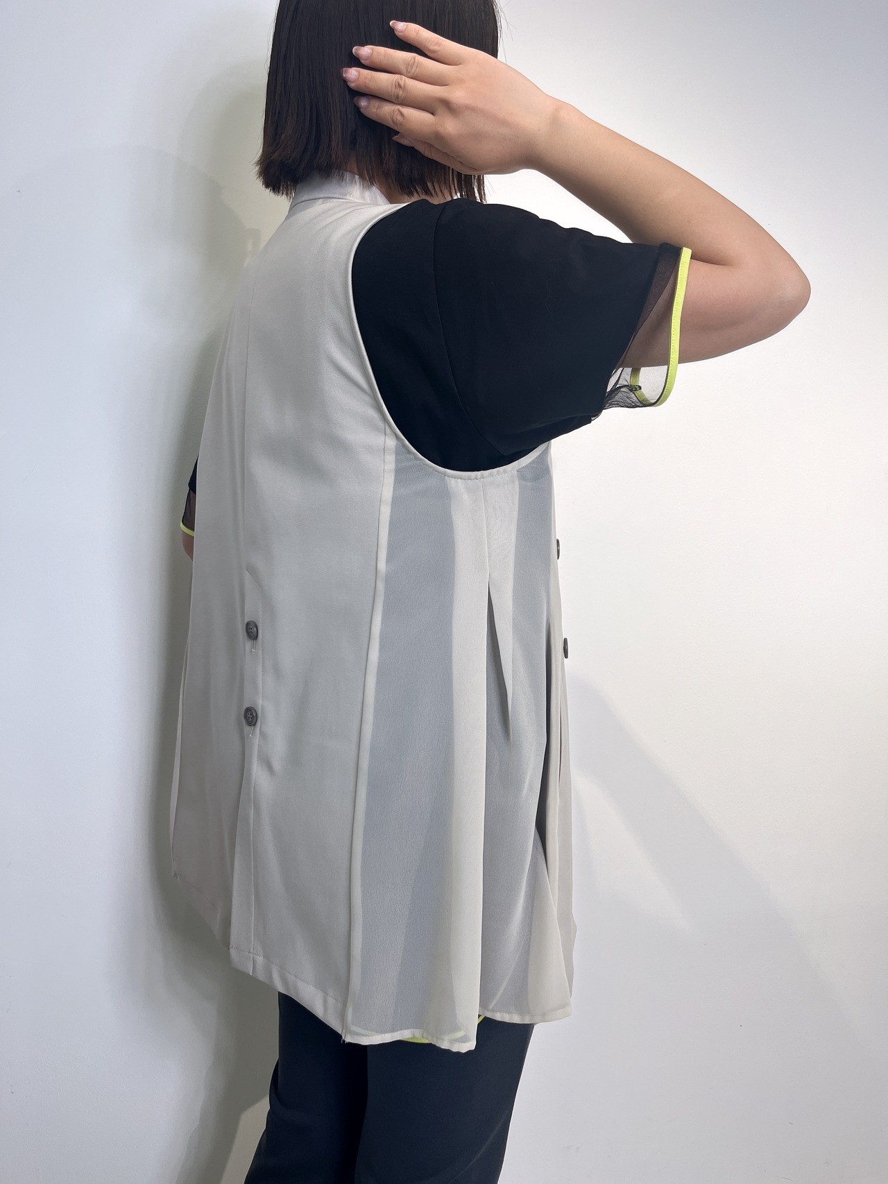 サイドで切り替えたシフォンが動くたびに揺れる、裏地のない軽い仕上がりのジレ。