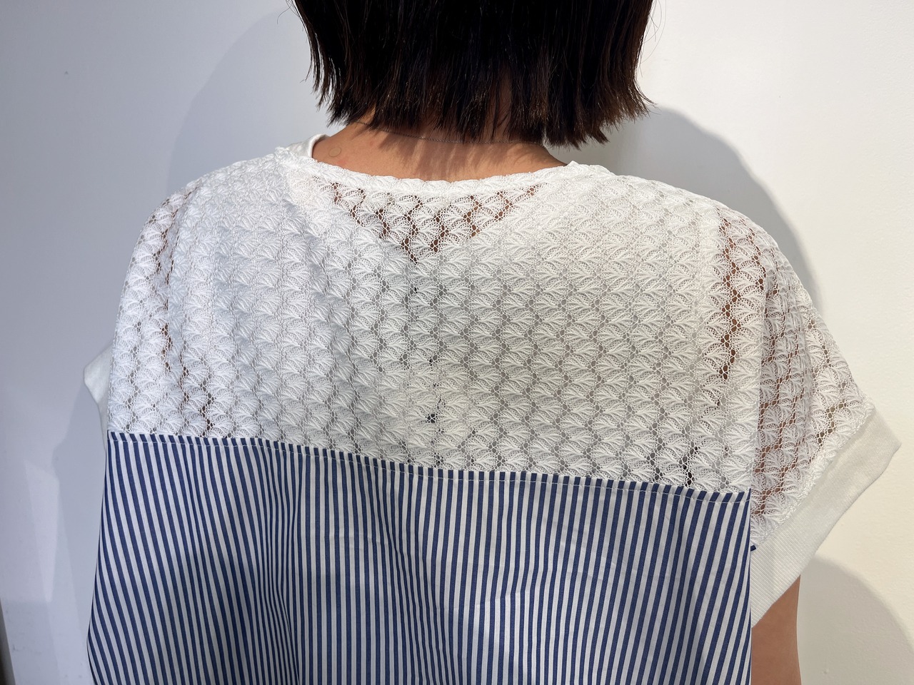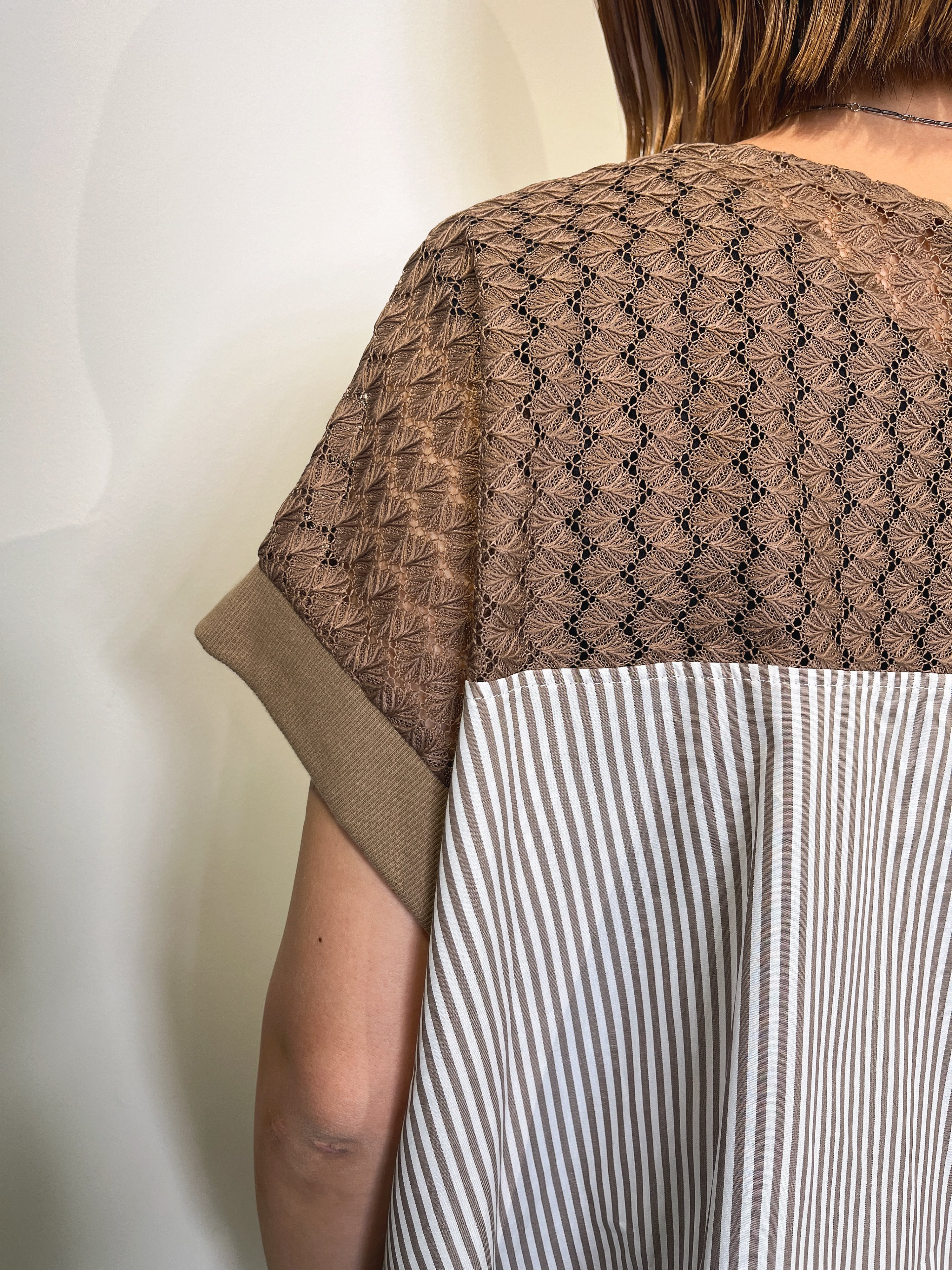 繊細で上品な透け感のポリエステルレースとハリのあるストライプを組み合わせたドルマンブラウス。