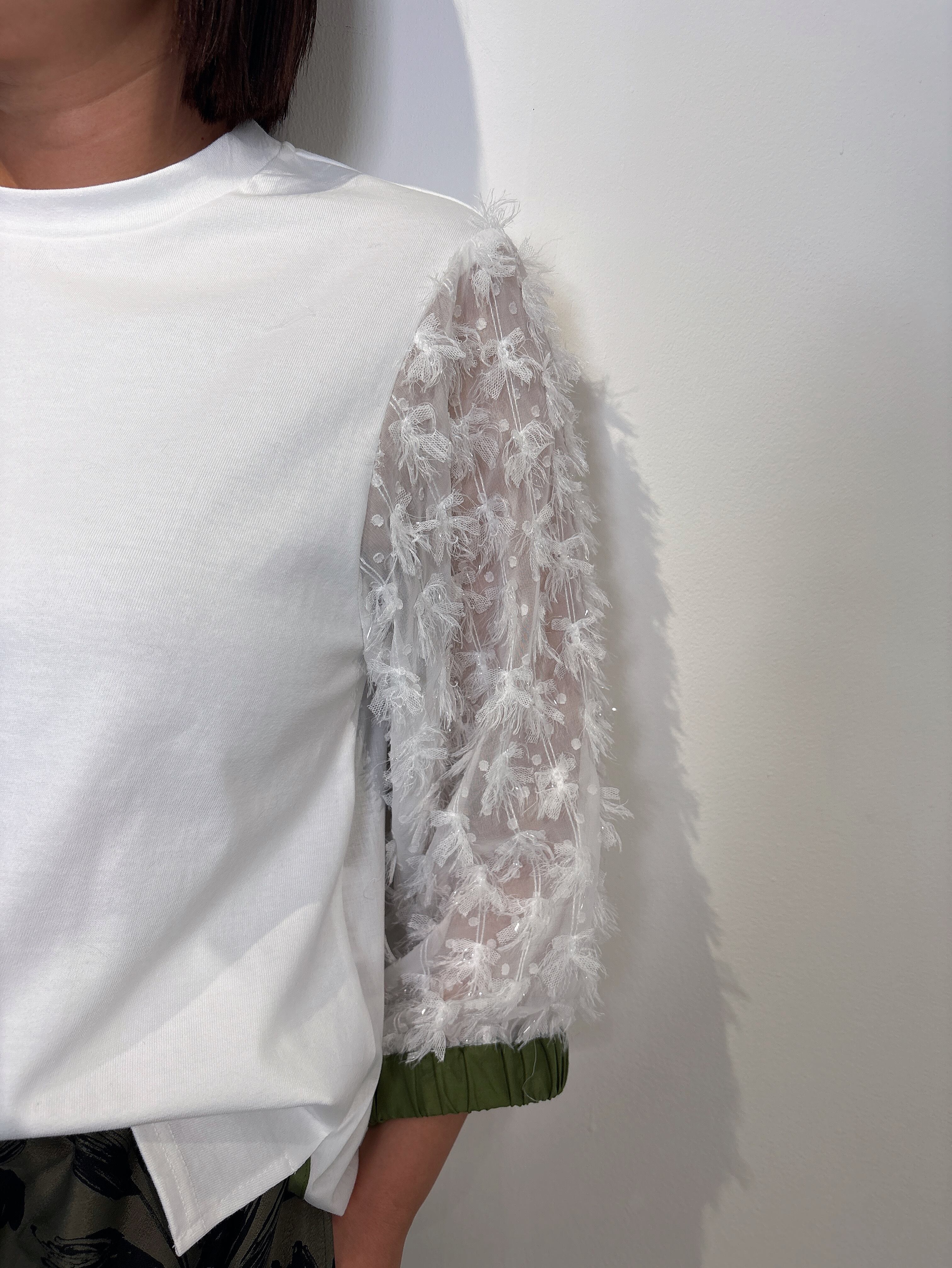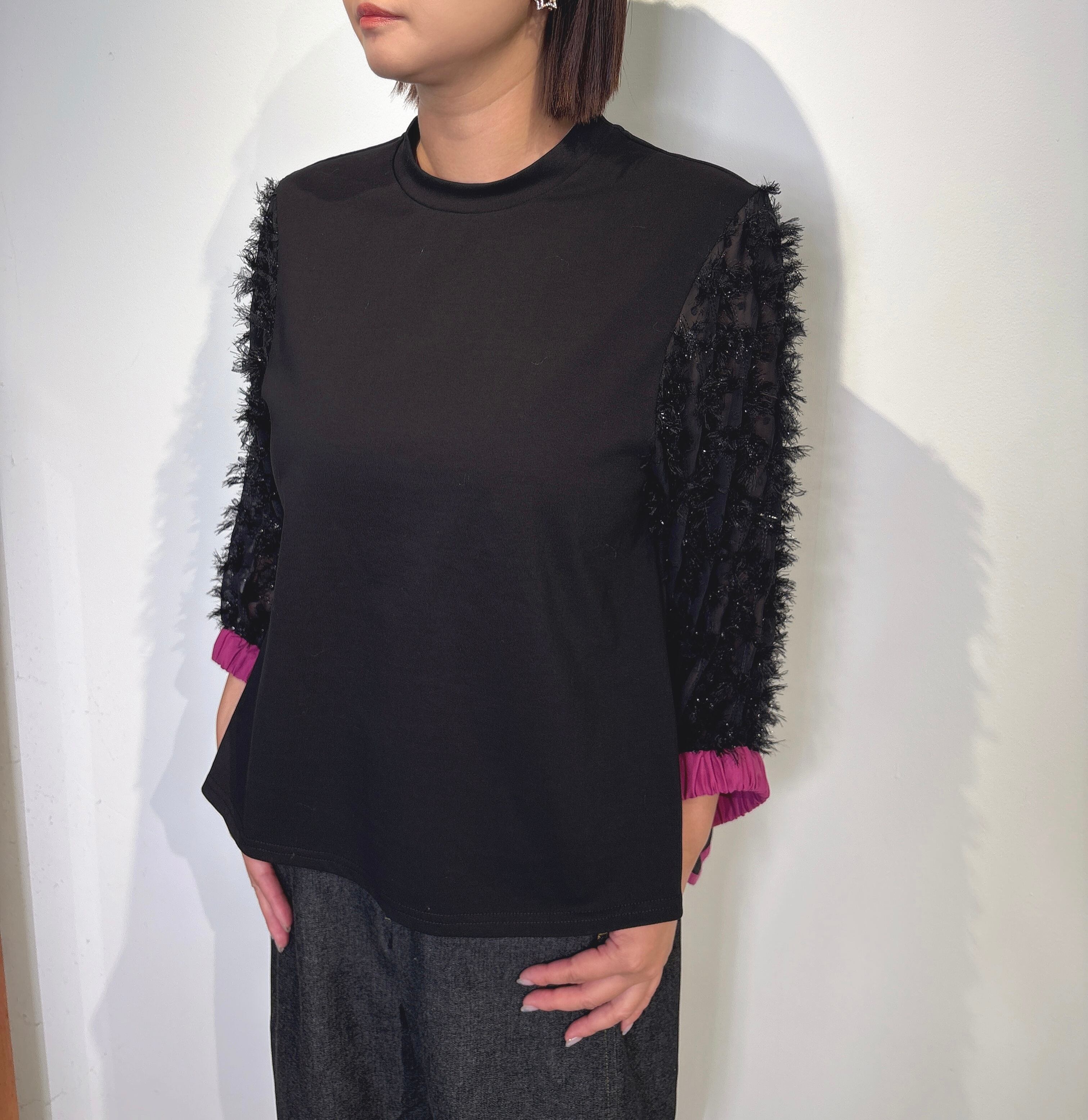 ほんのり透けるカットジャガードの異素材スリーブが、シンプルながら視線を惹きつける1枚。動くたびにふんわりと揺れる軽やかな生地感が、季節の変わり目にもぴったりです。さらに、袖口と裾に効かせた配色デザインが、スタイリングにさりげないスパイスをプラス。