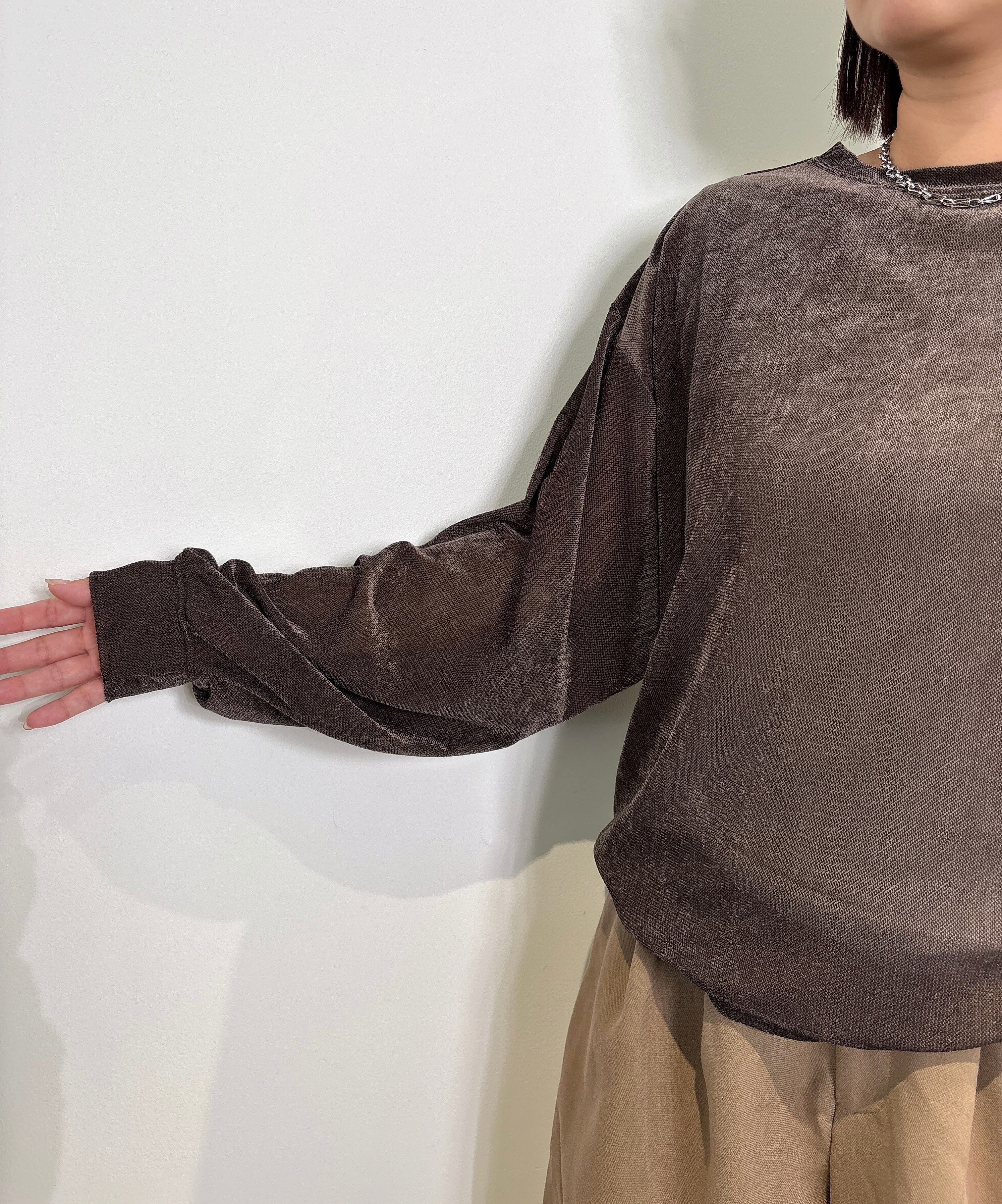 メッシュのベロア素材を使用したプルオーバーです。コンパクトな丈感とボリュームたっぷりの袖がポイントです。