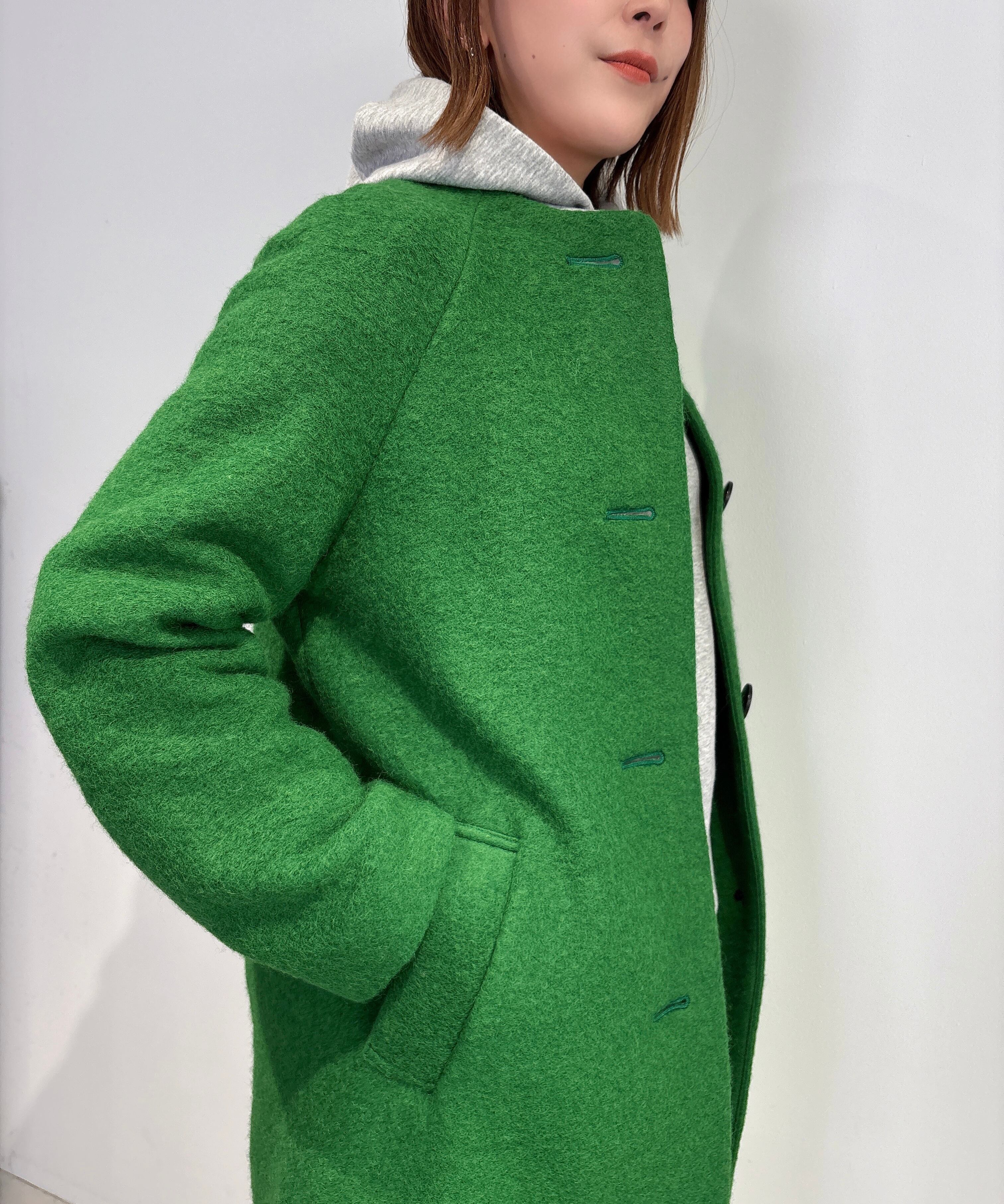 ノーカラーだから首元がスッキリし、どんなインナーとの重ね着にもマッチします。