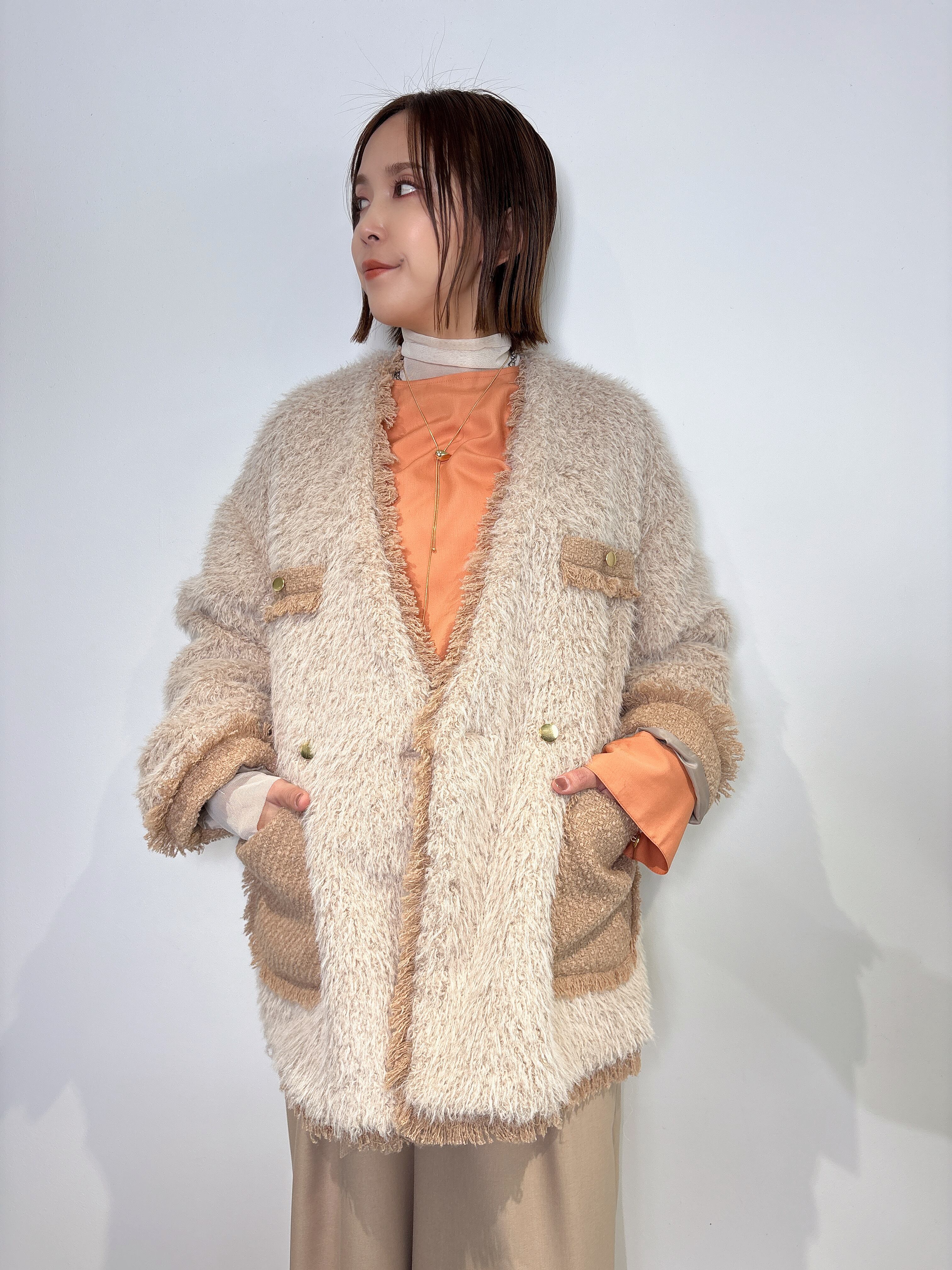 暖かく高級感のあるフェイクファーにツイードのポケットを施したクラシカルな雰囲気のJK。