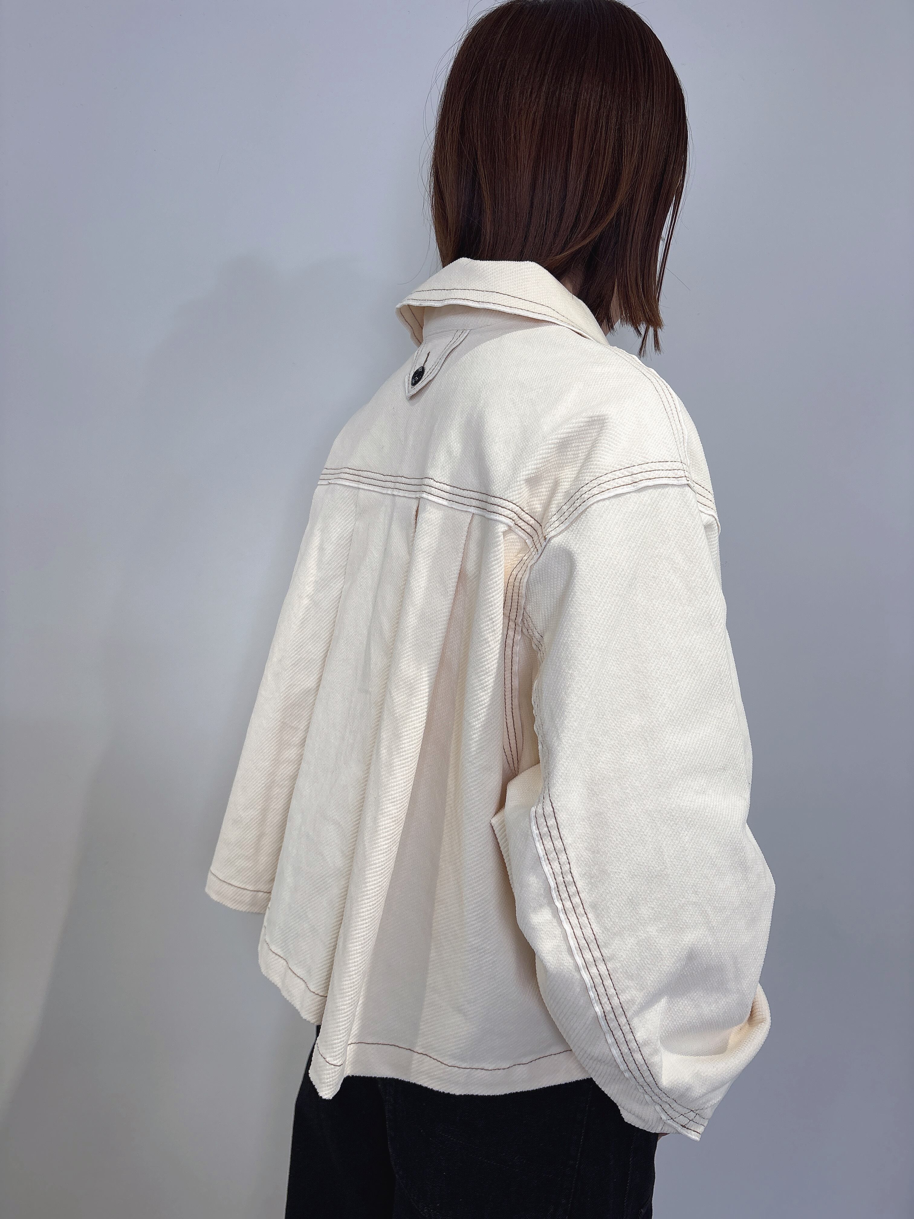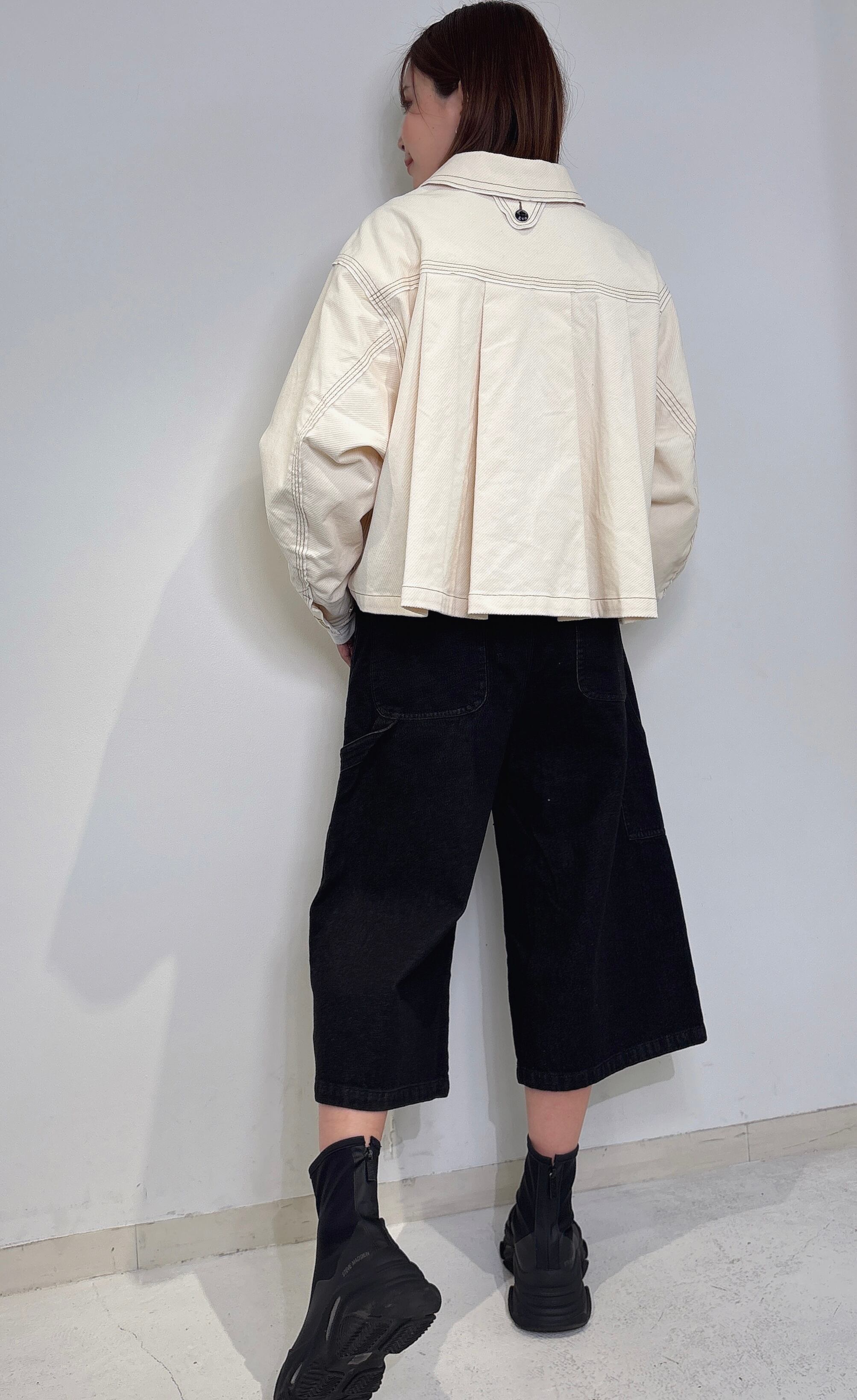 ゆったりとした身幅とドロップショルダーが生み出すリラックス感に、バックの深めのタックで立体的なボリュームをプラス。動くたびにふわりと広がるシルエットが印象的です。