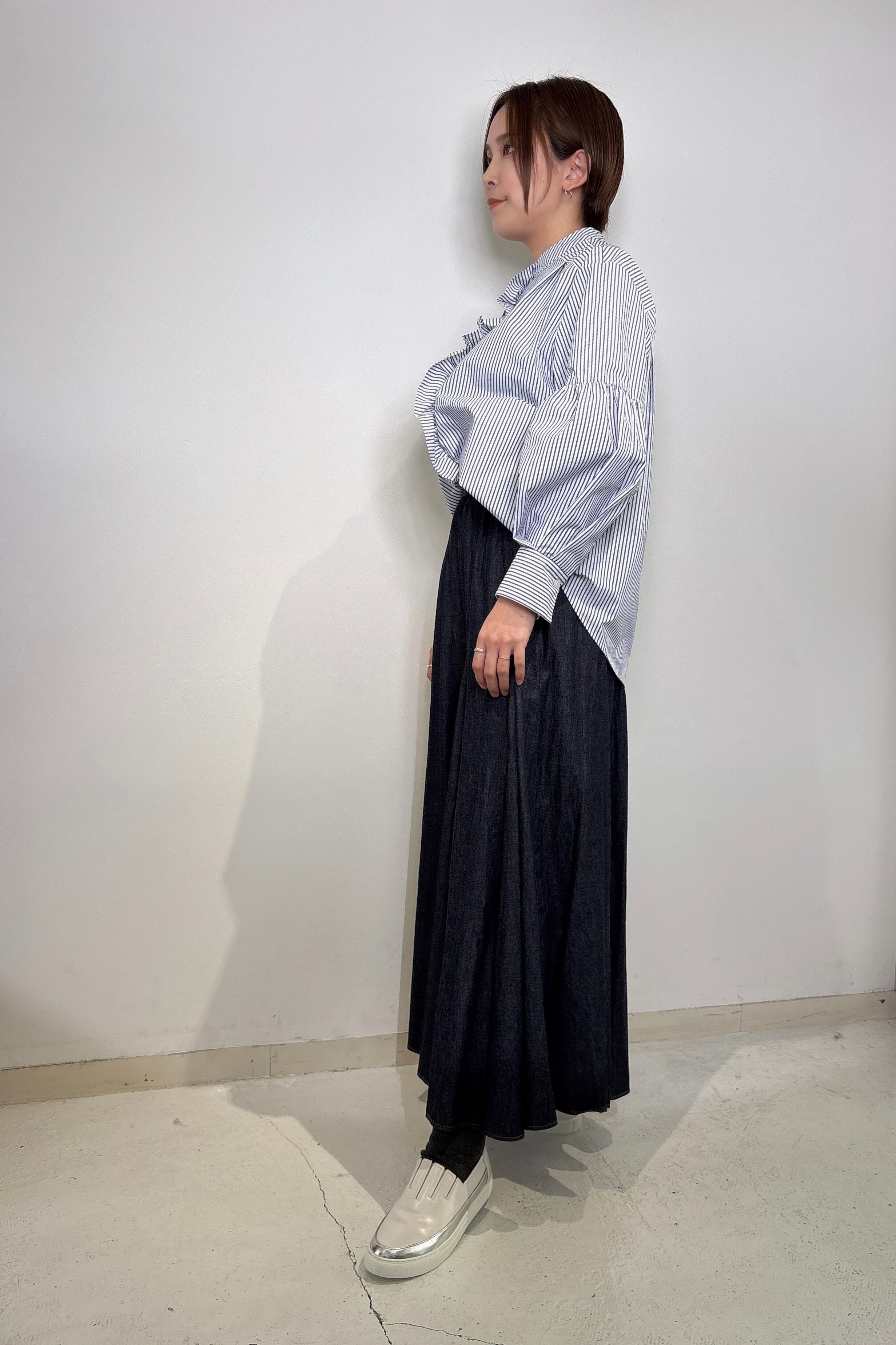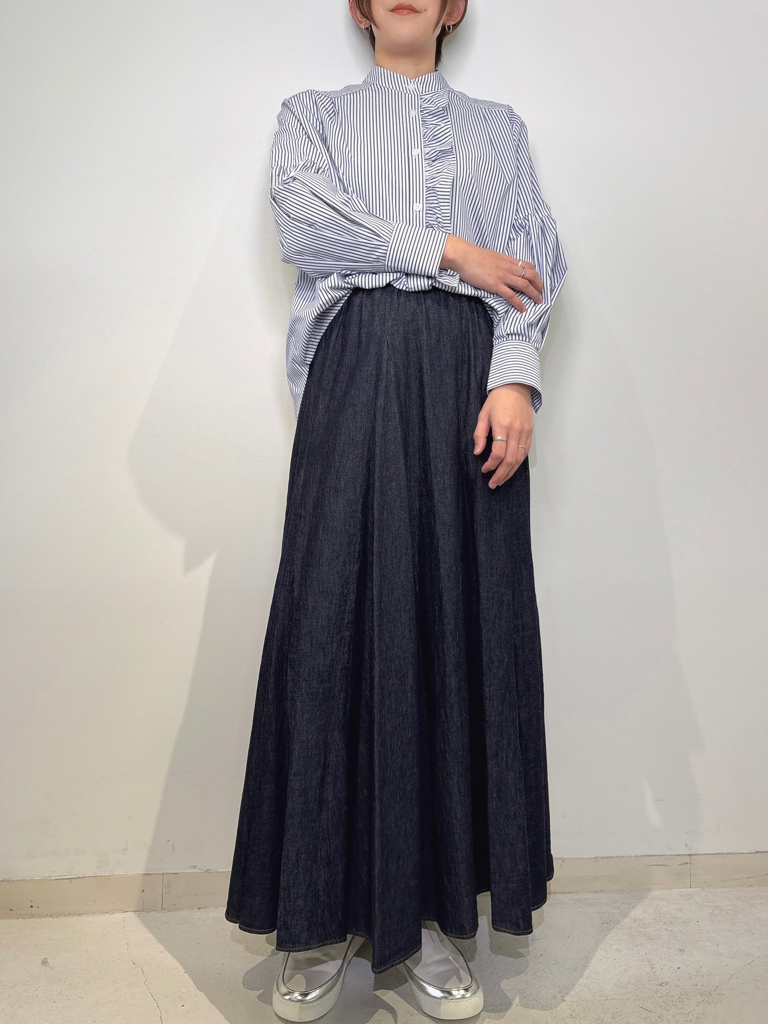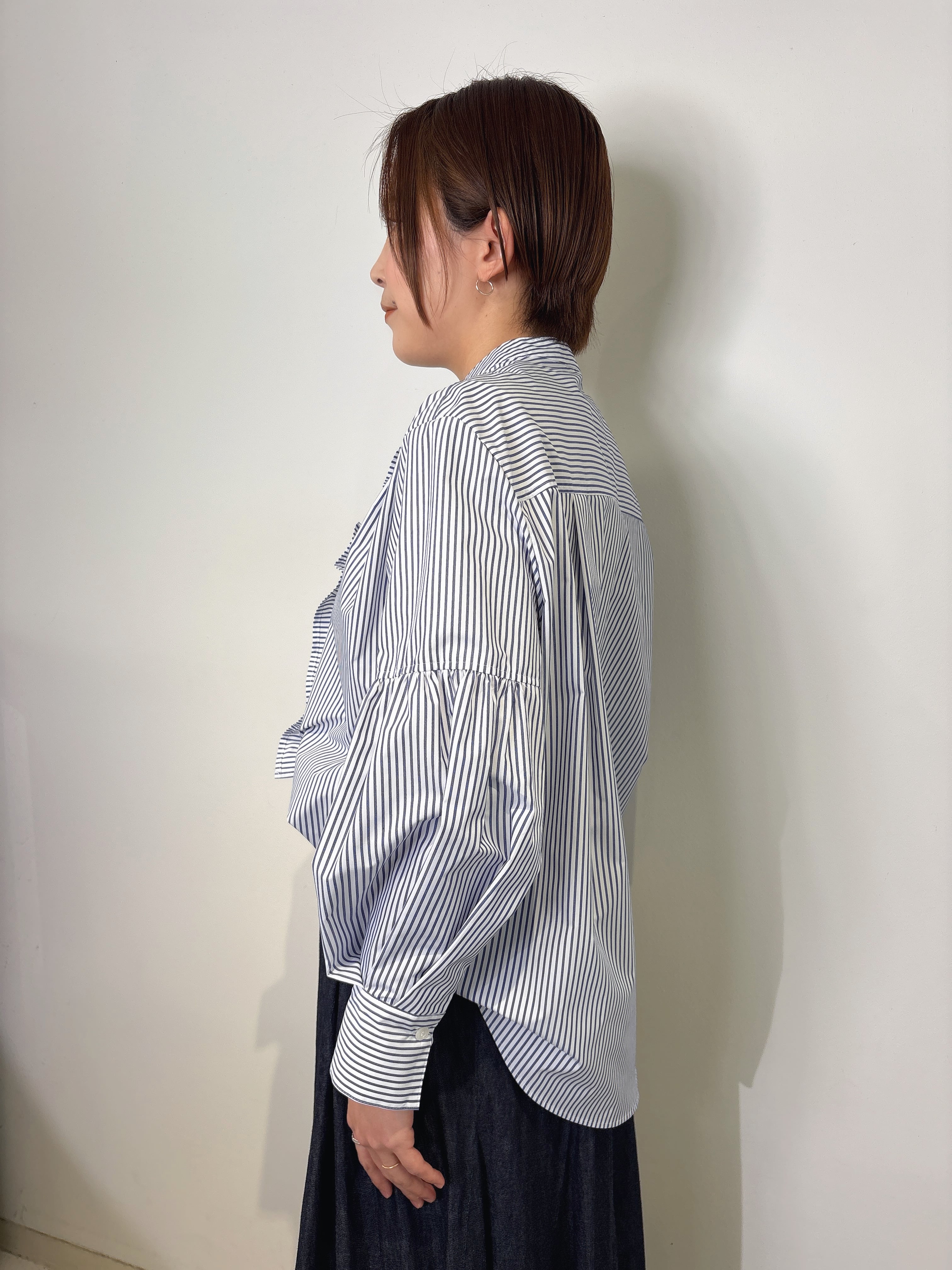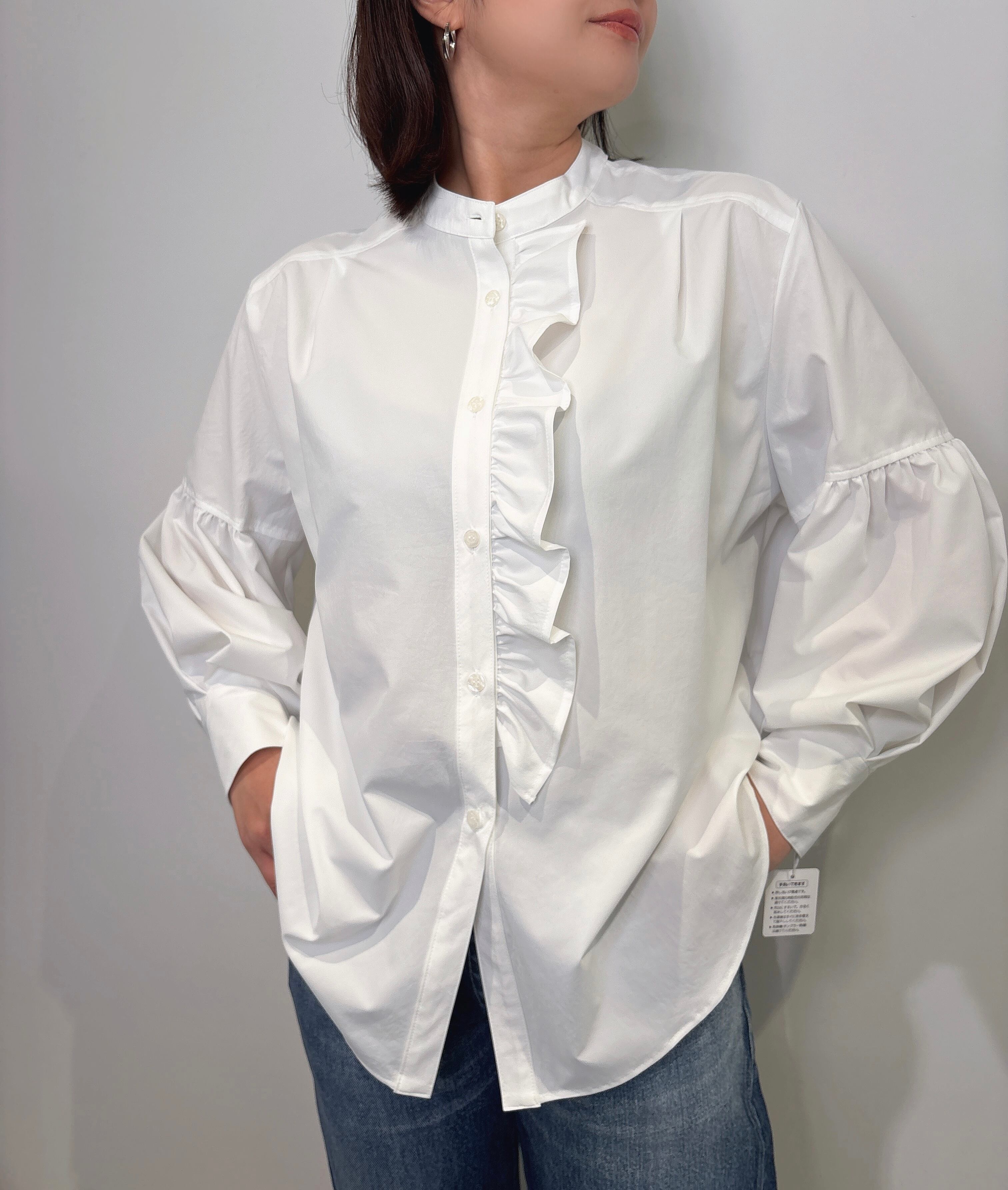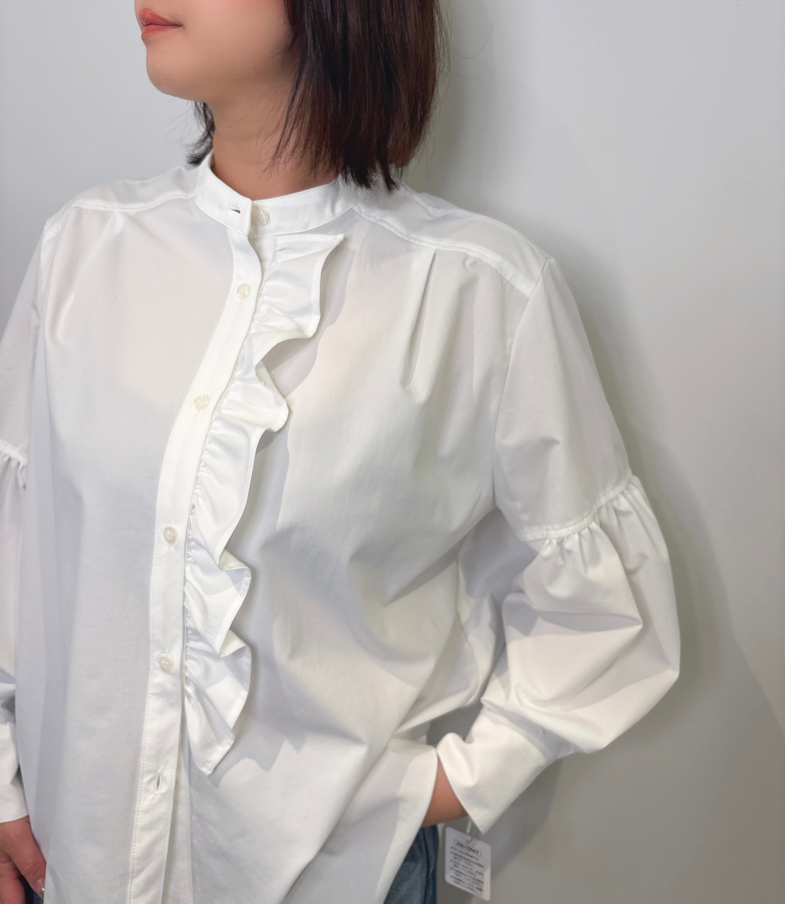 フリルと袖のギャザーでクリーンな中に程よい甘さのあるバンドカラーブラウス。