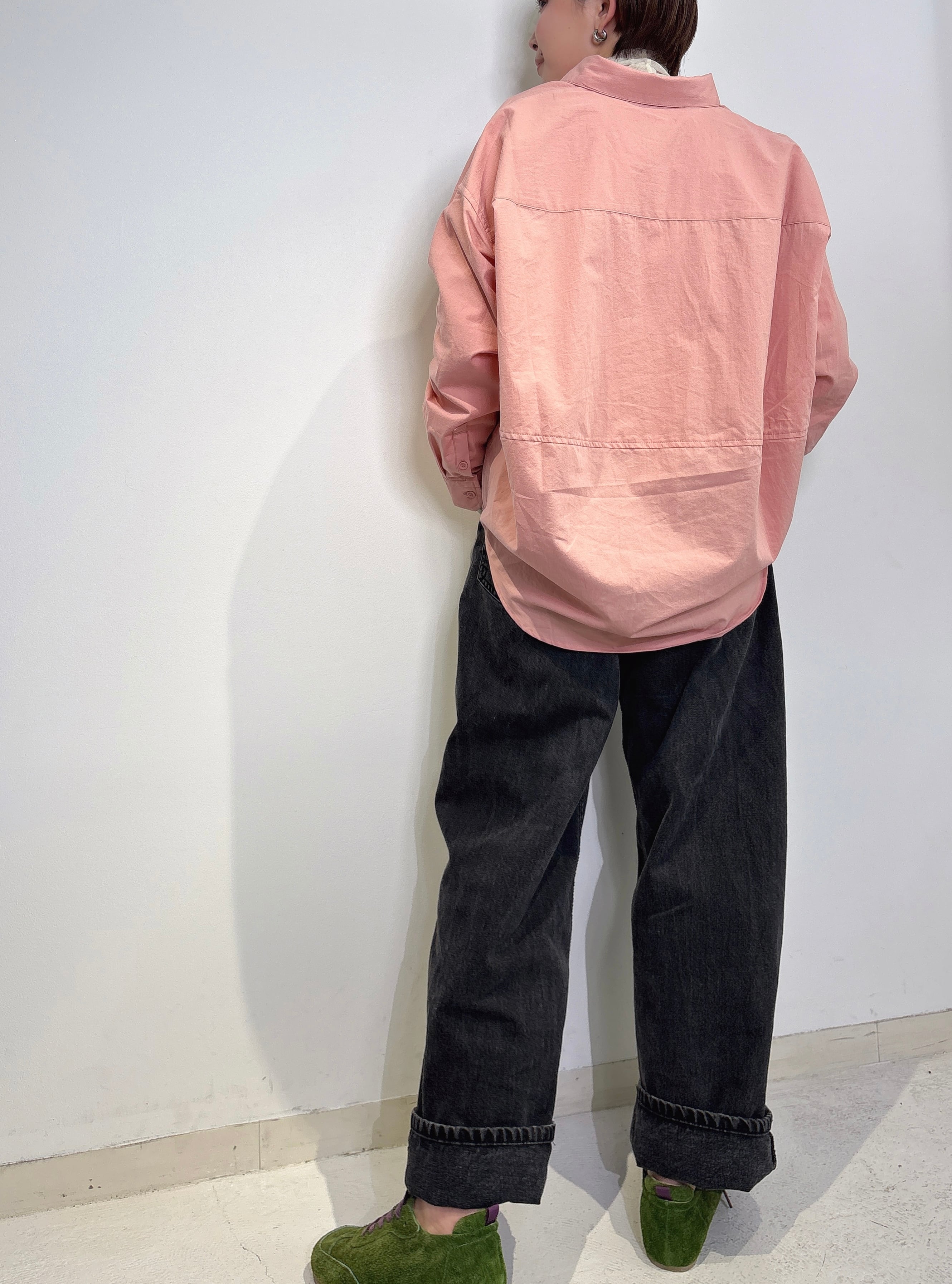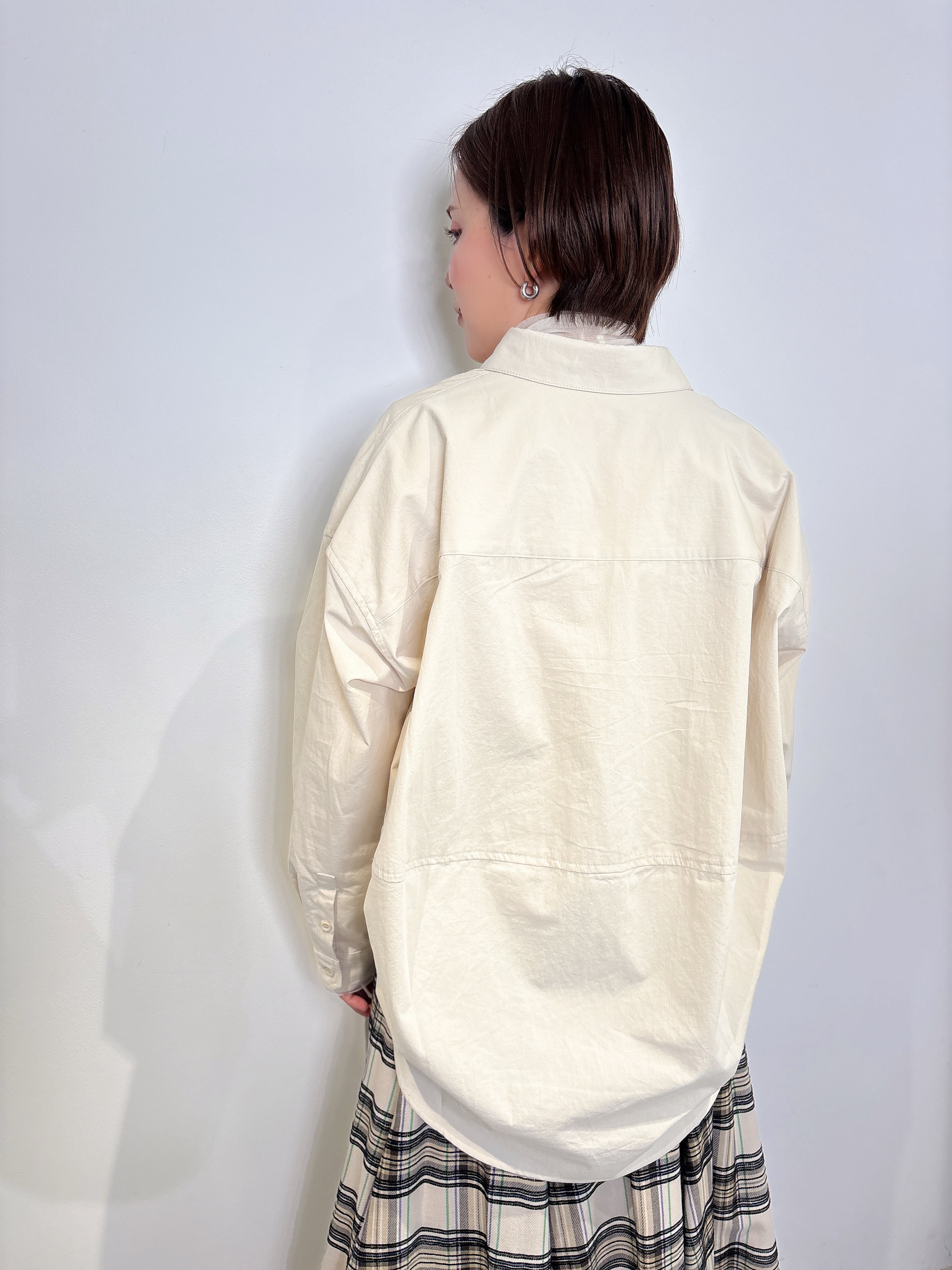後ろの身中をたっぷりとって展開したパターンにより立体的で丸みのある女性らしいバックスタイルに仕立てたシンプルなレギュラーカラーシャツです。