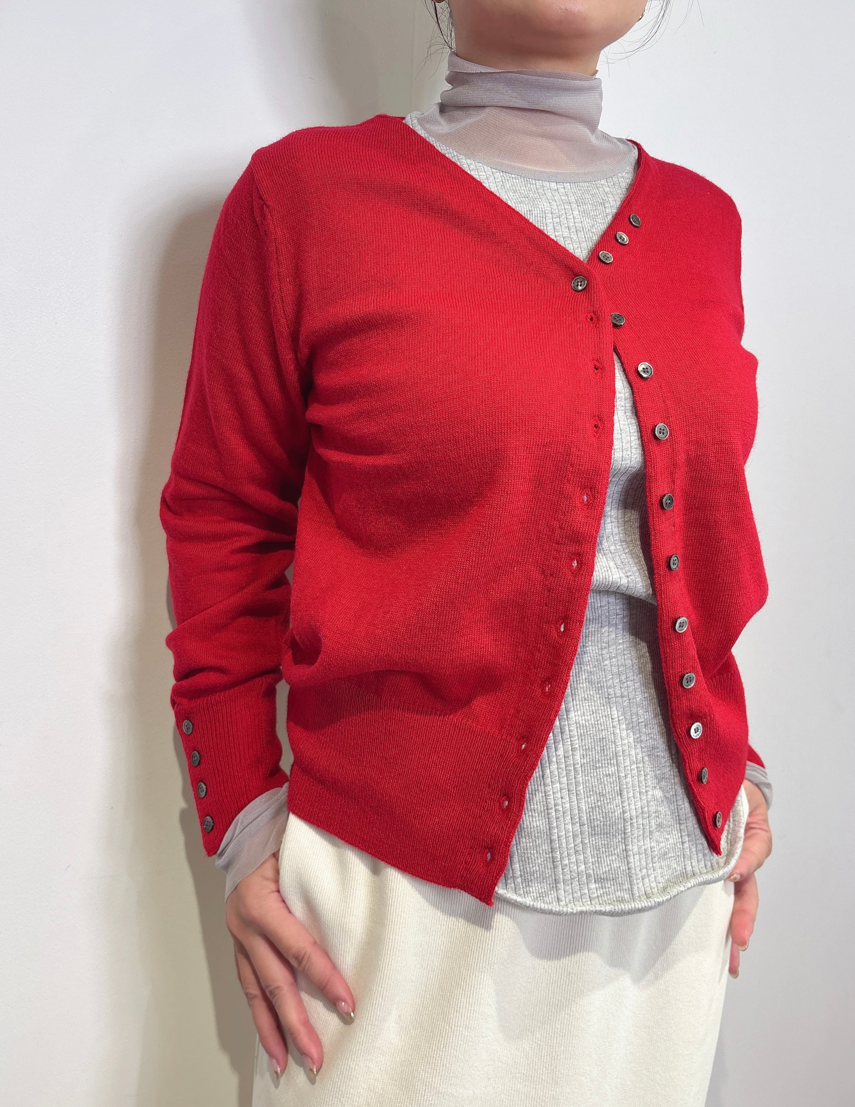すっきりとしたVネックのデザインと特徴的なボタンが施された特徴のカーディガンです。