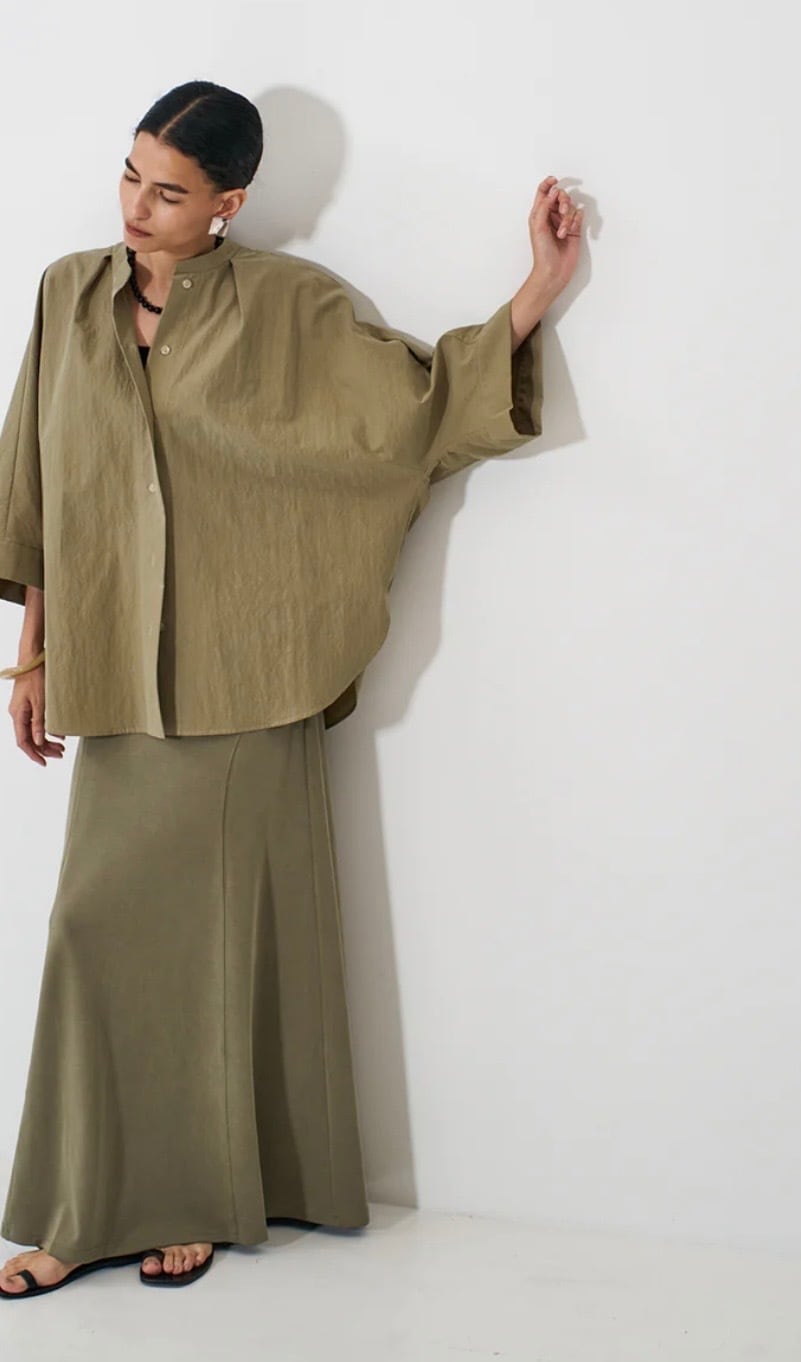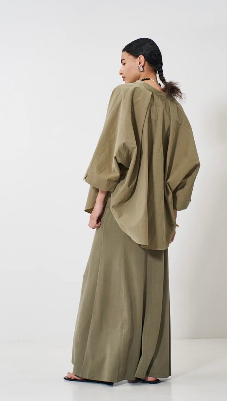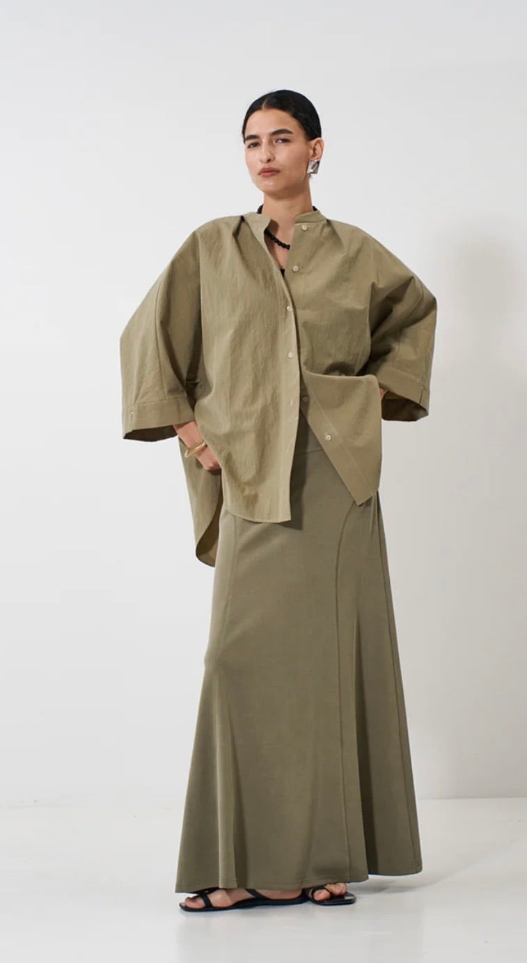 ハリのある素材で作るオーバーサイズのシャツは、体から浮くので風通しが良く、涼しく着用いただけます。