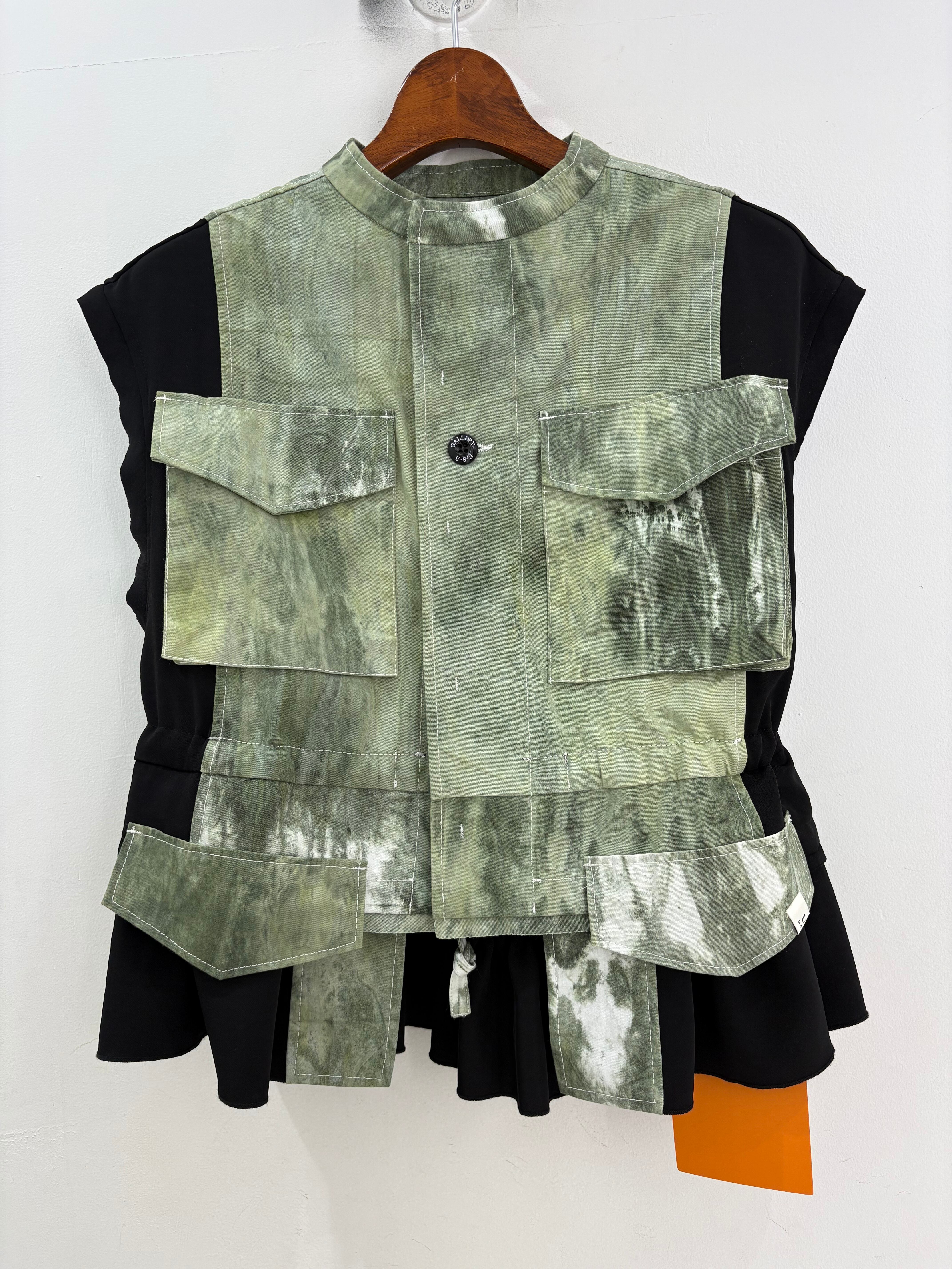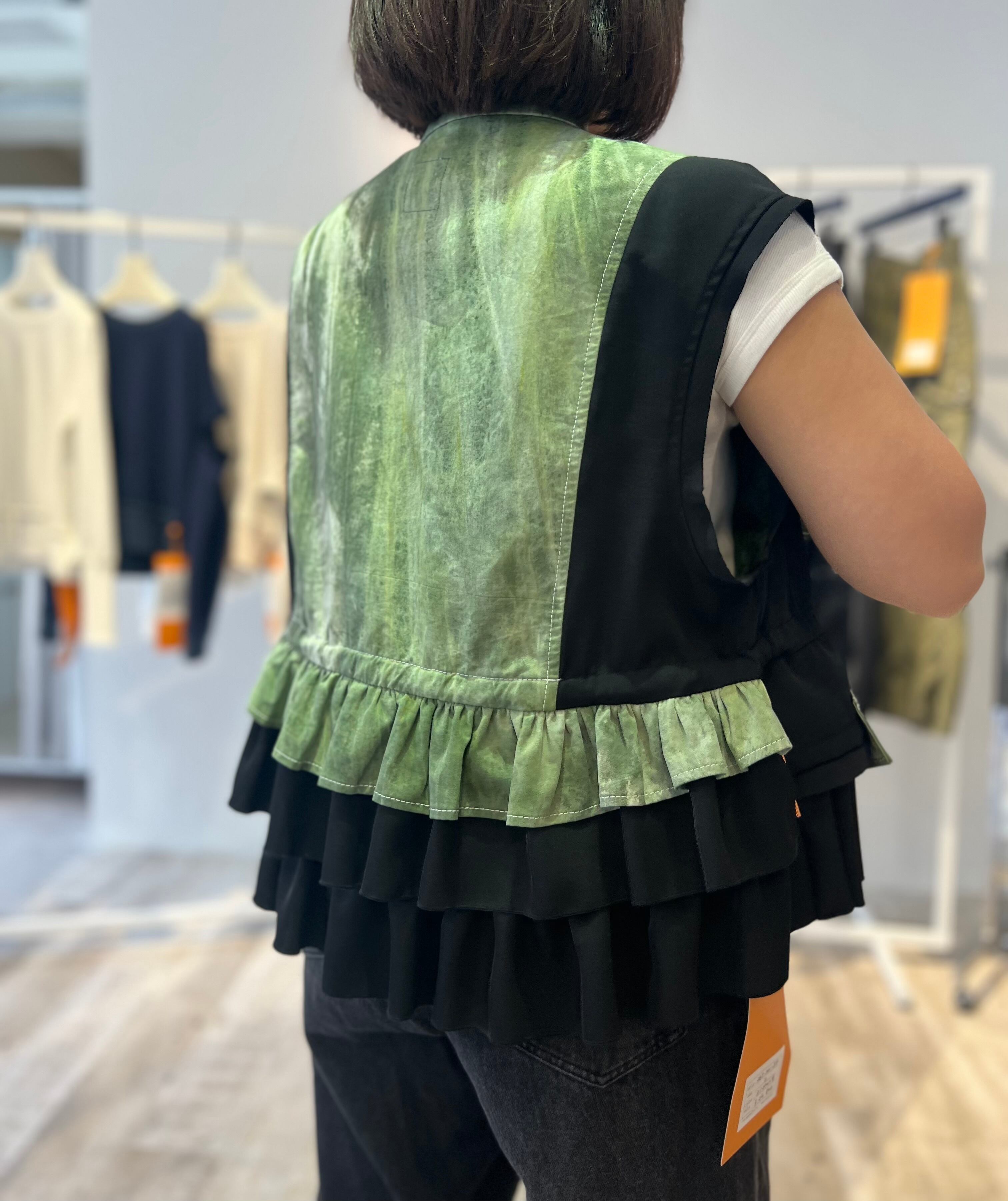 存在感のあるムラ染加工が施されたツイルとデニムのベストは、スタイルにグッと個性をプラスします。