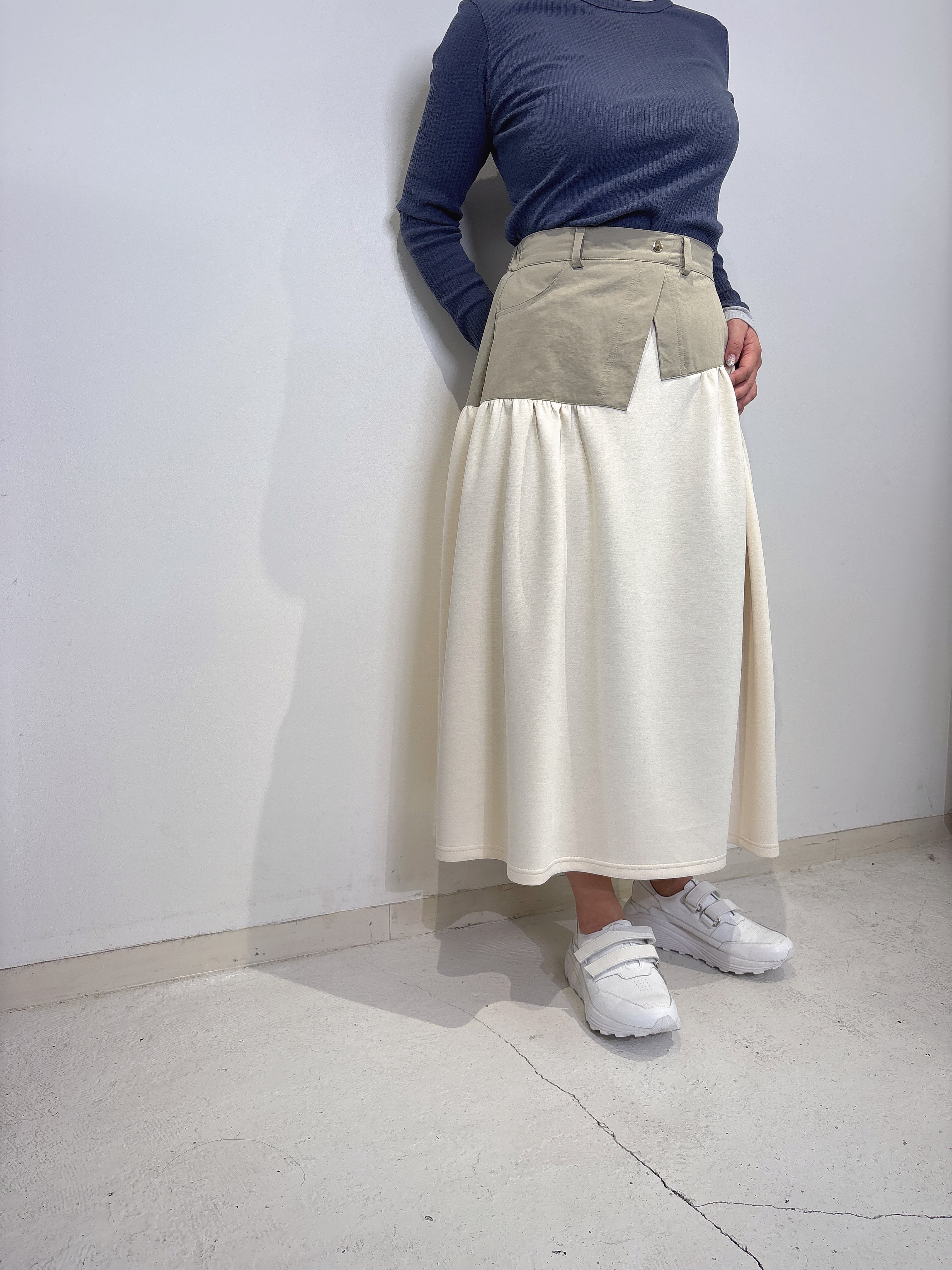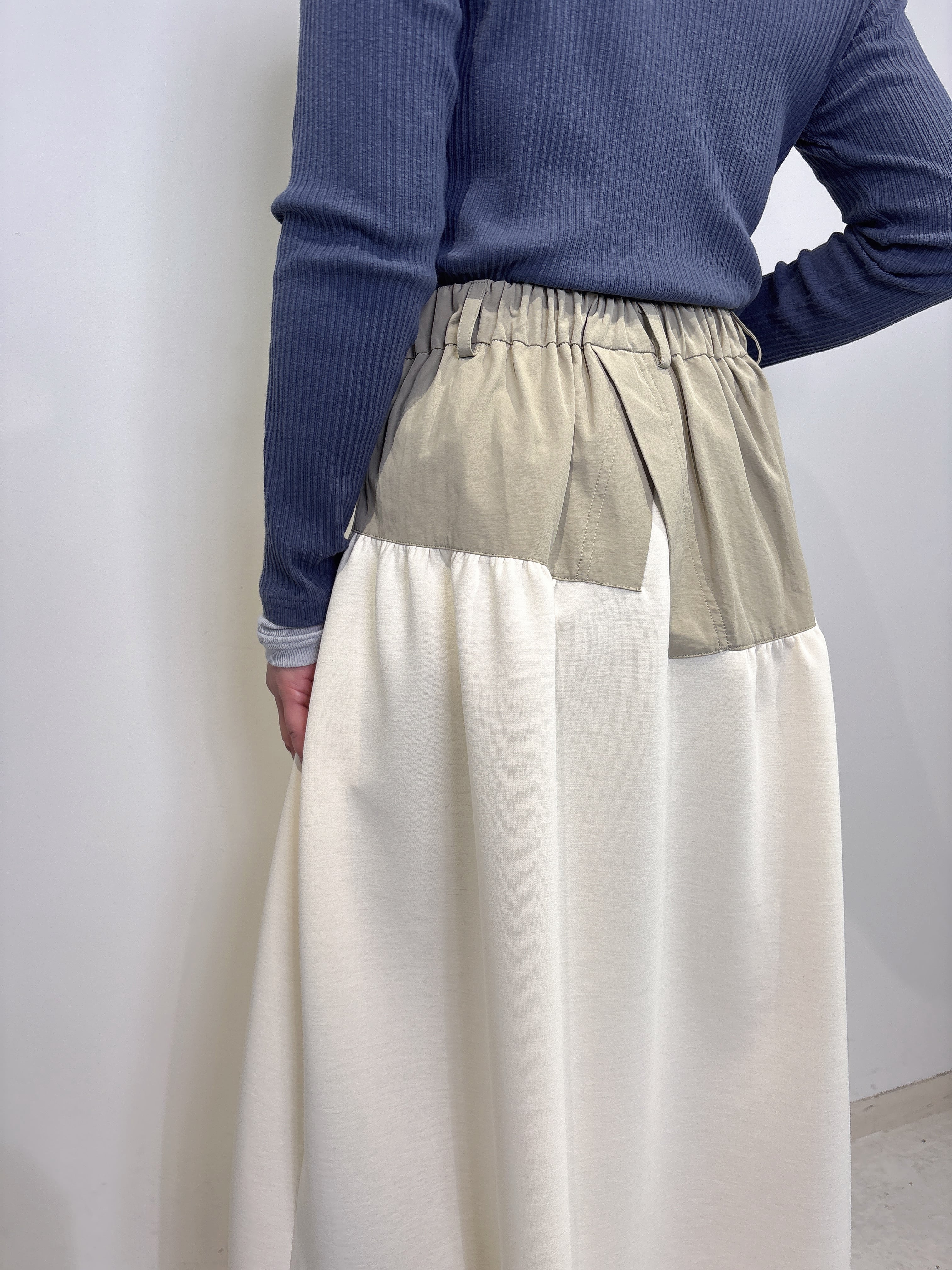 柔らかく軽いダンボールニットに、ハリ感のあるT/Cタフタをドッキングさせたフレアスカート。