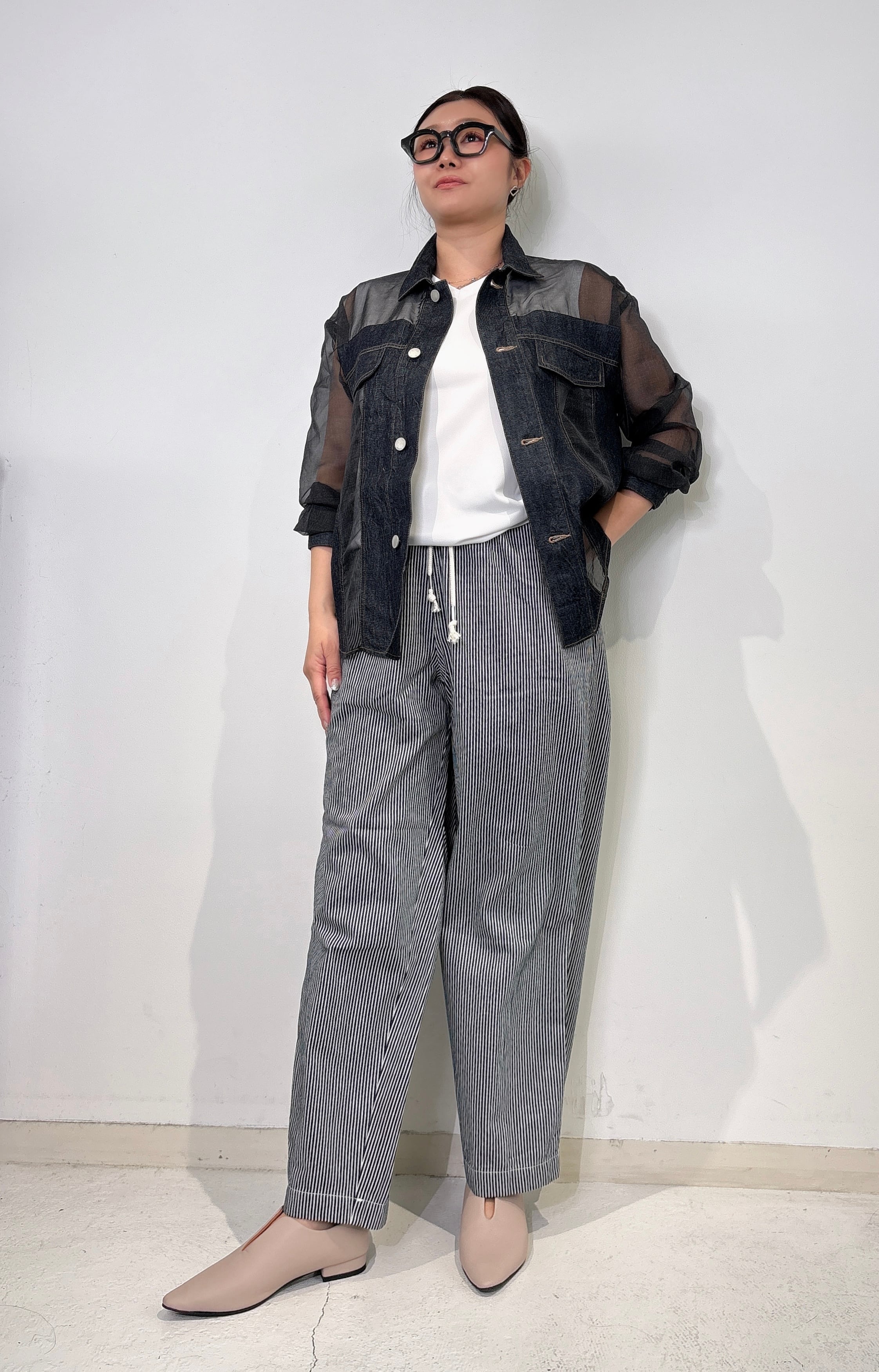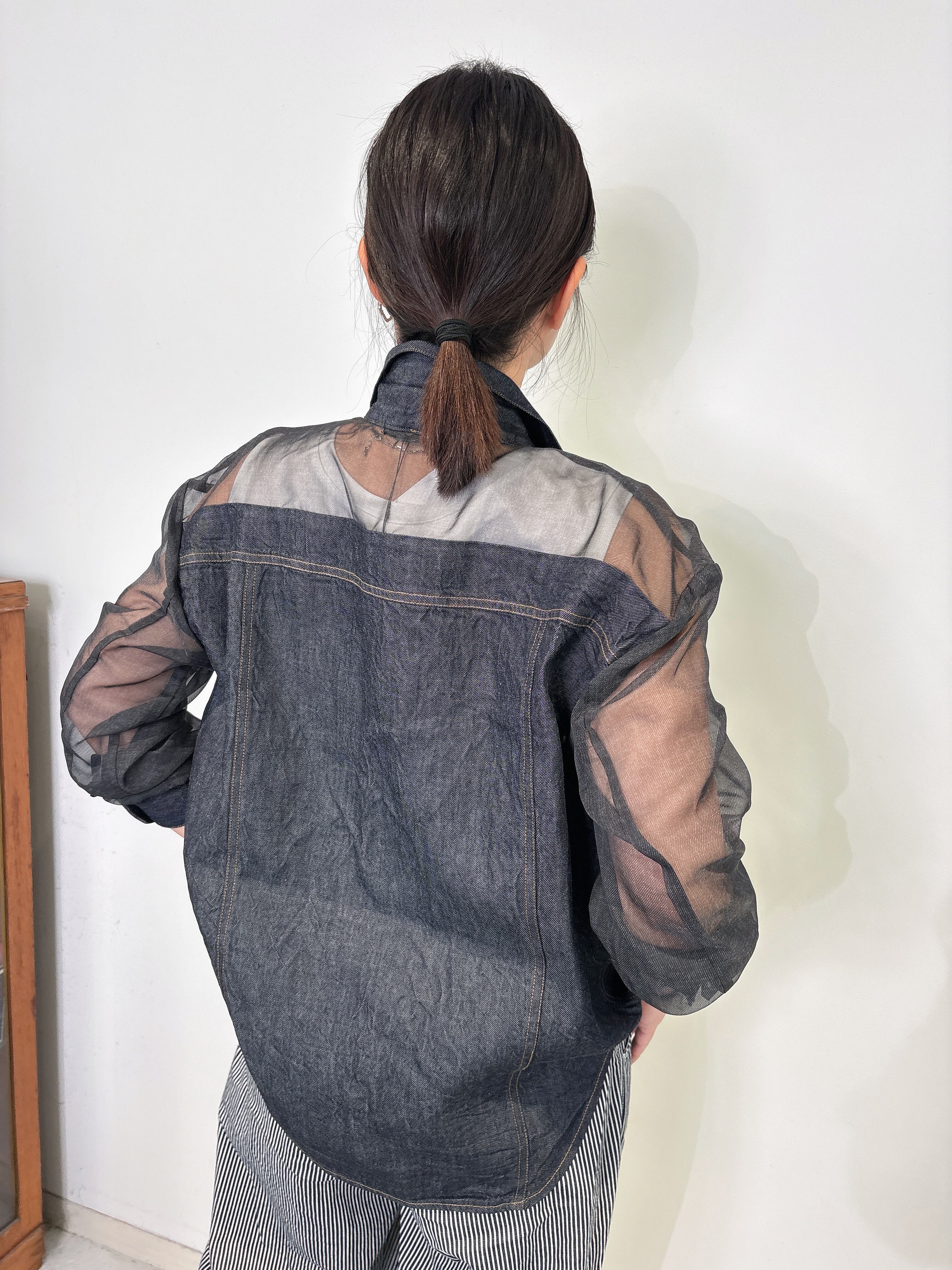 デニムxデニムプリントオーガンジーをドッキングさせアクセントをつけた羽織としても使えるデザインシャツです。