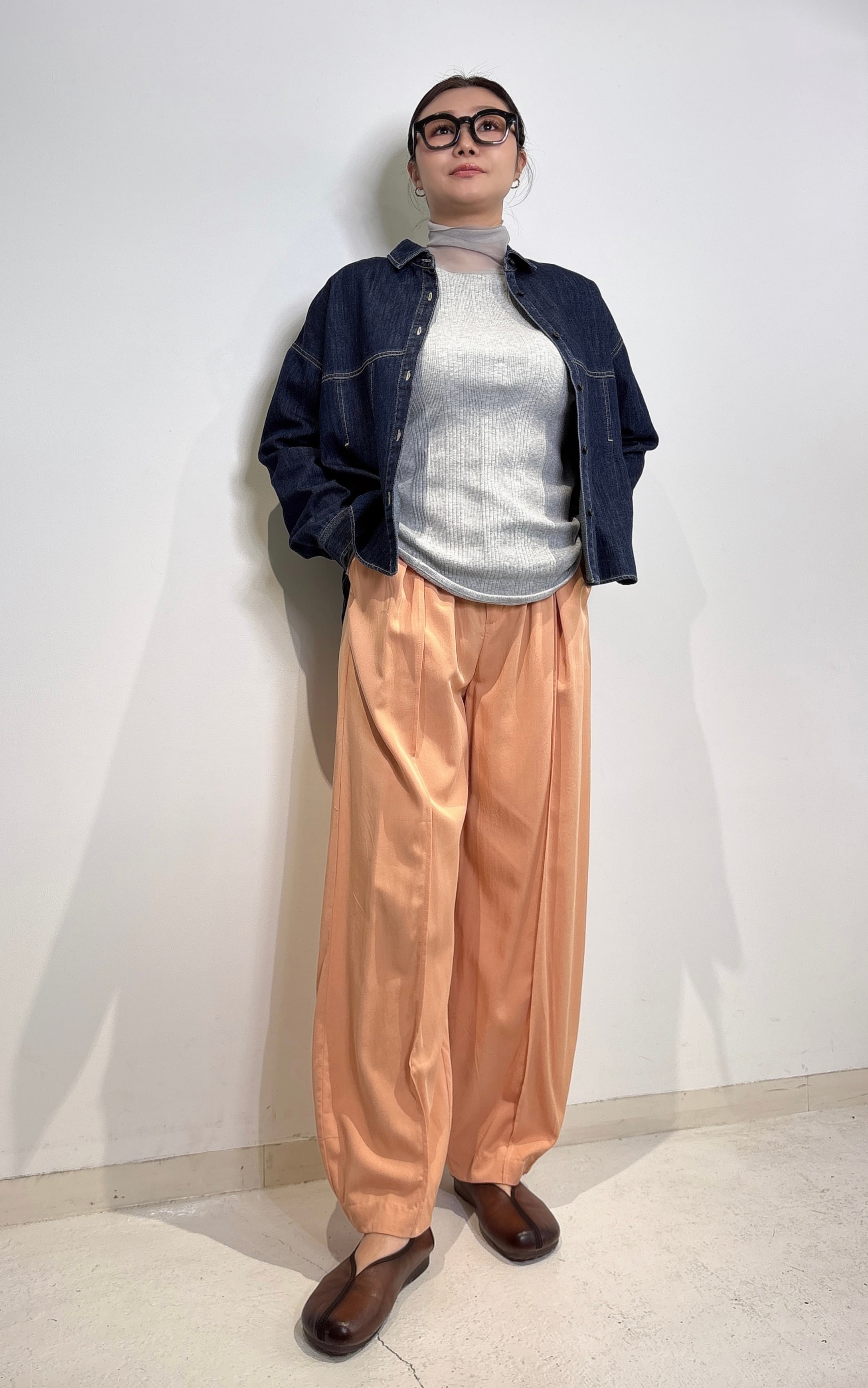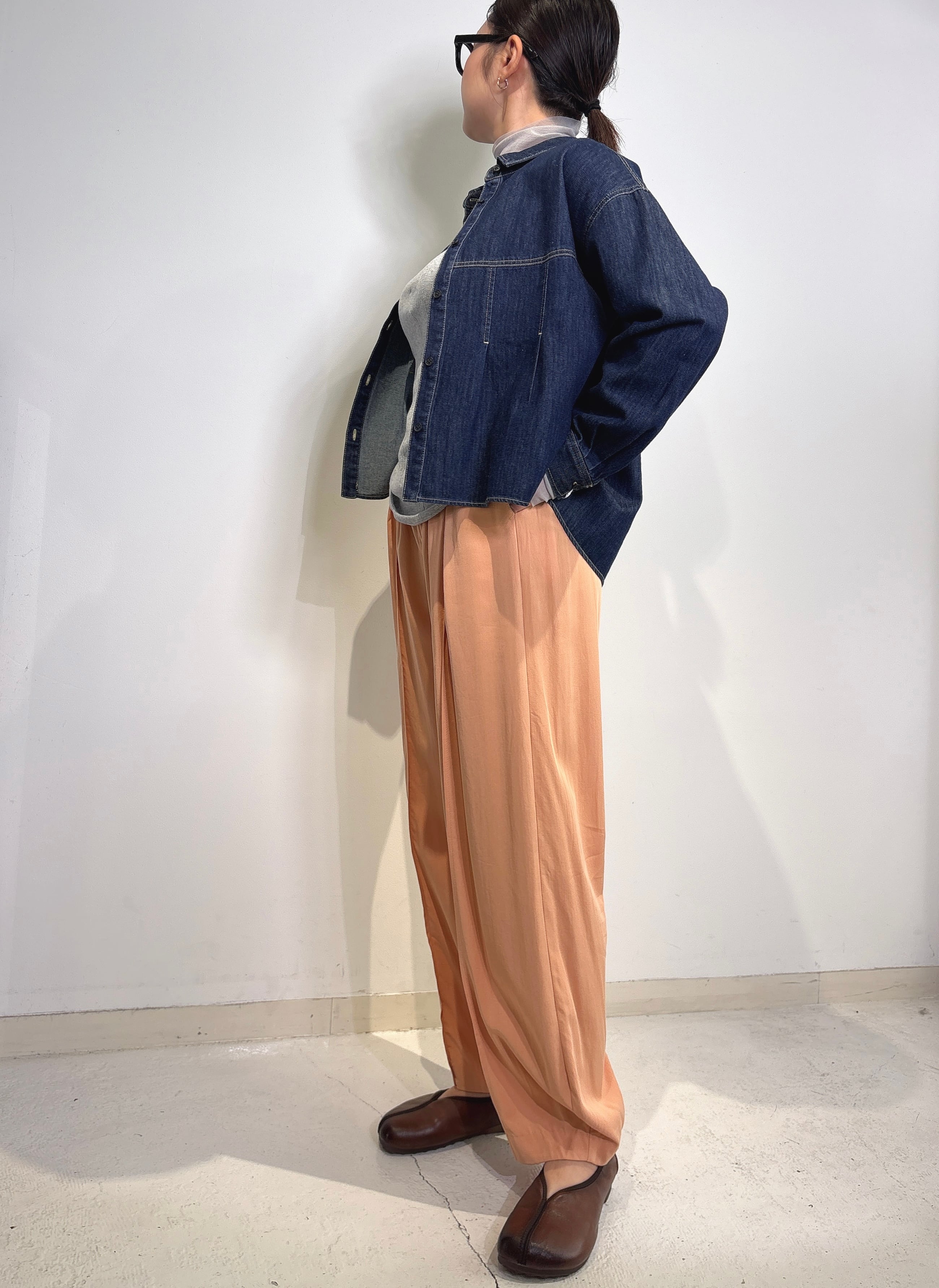 今回はテンセル素材を使い、落ち感と柔らかさをプラスしました。落ち感があるので、定番のシルエットが新鮮に見えて、より履きやすくなっています。