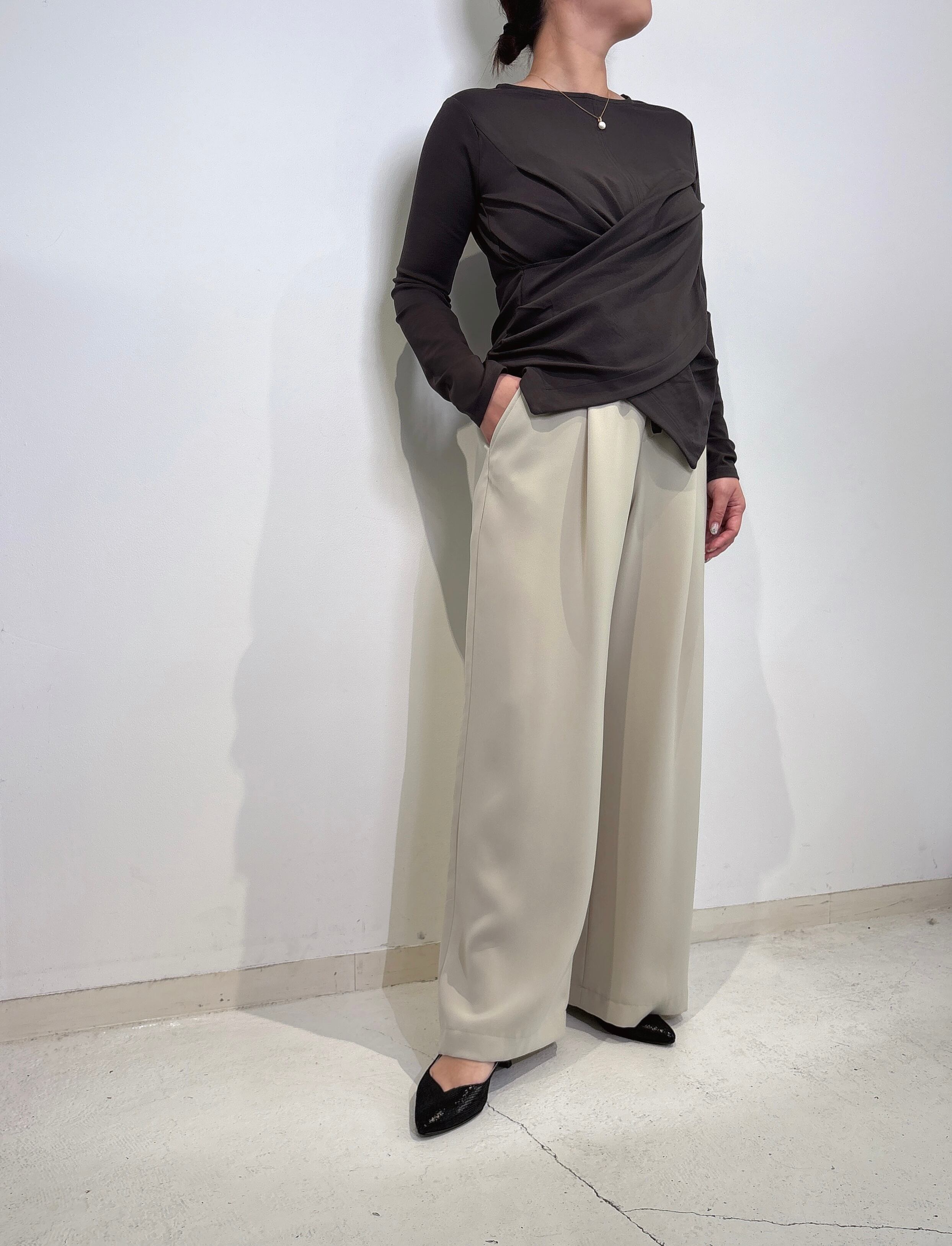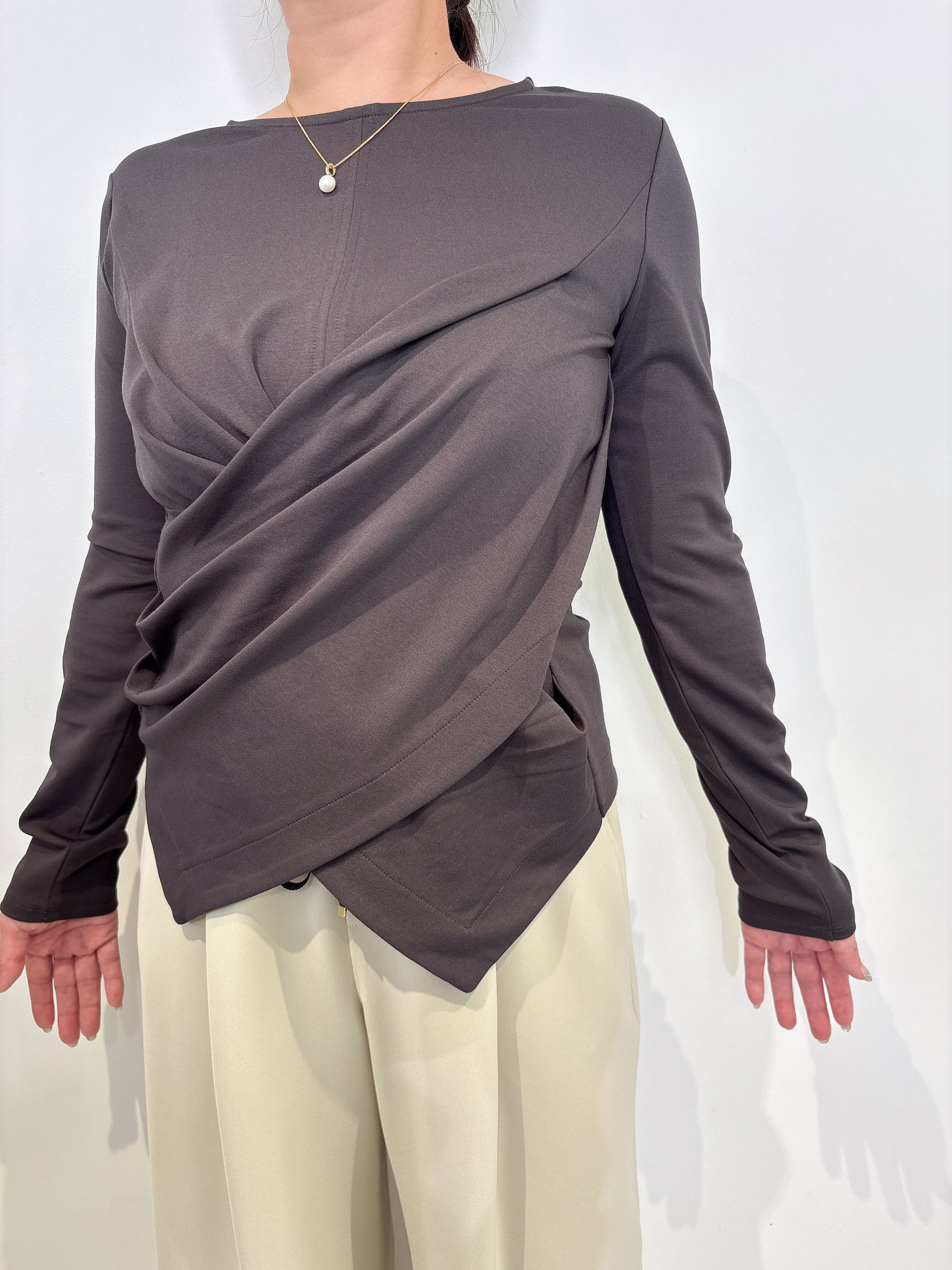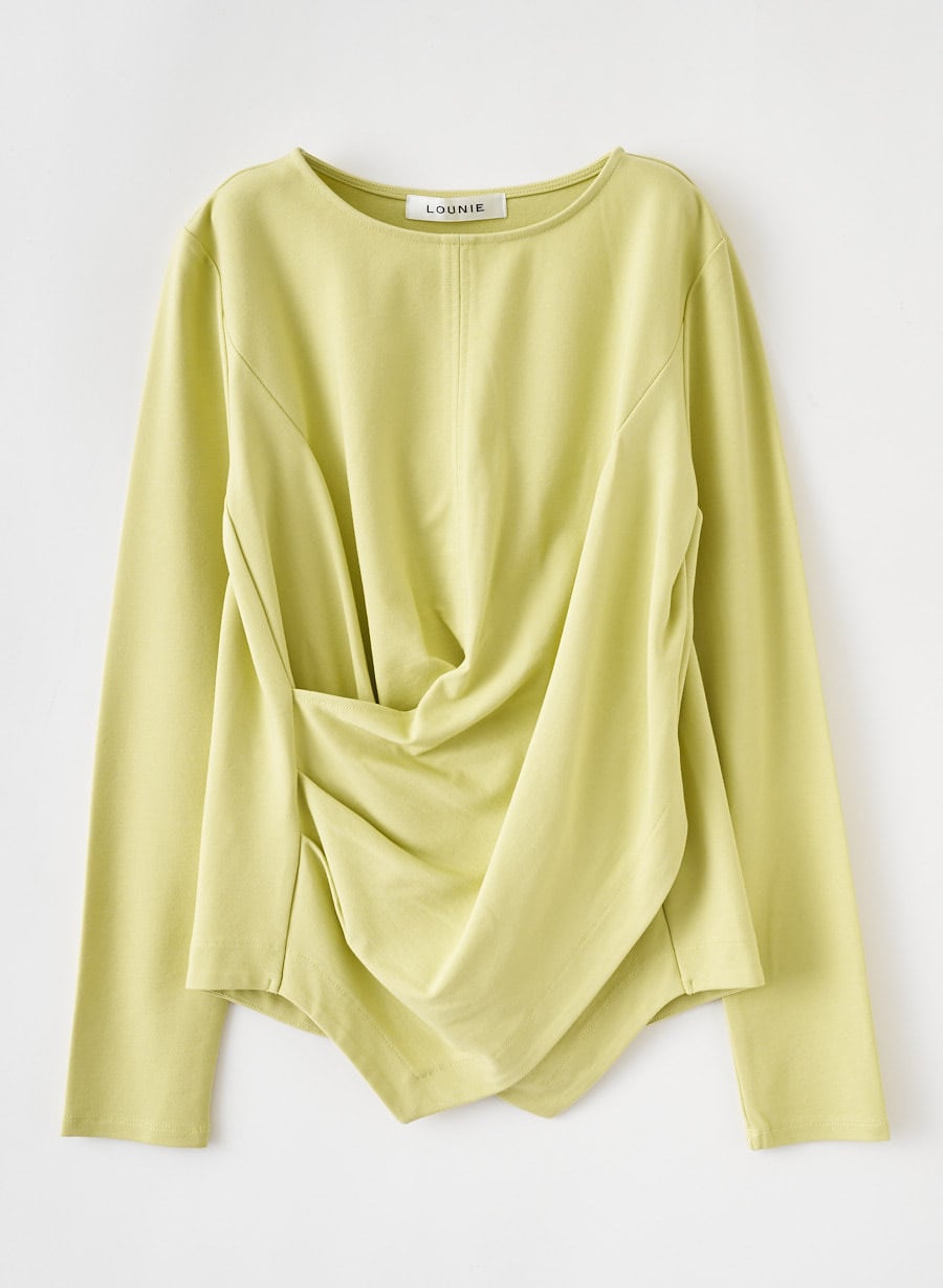・シンプルに見えがちなロンTを、ウエスト・フロントの大胆なひねりデザインで一気にアップデートしました。