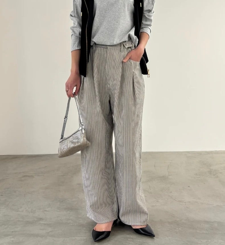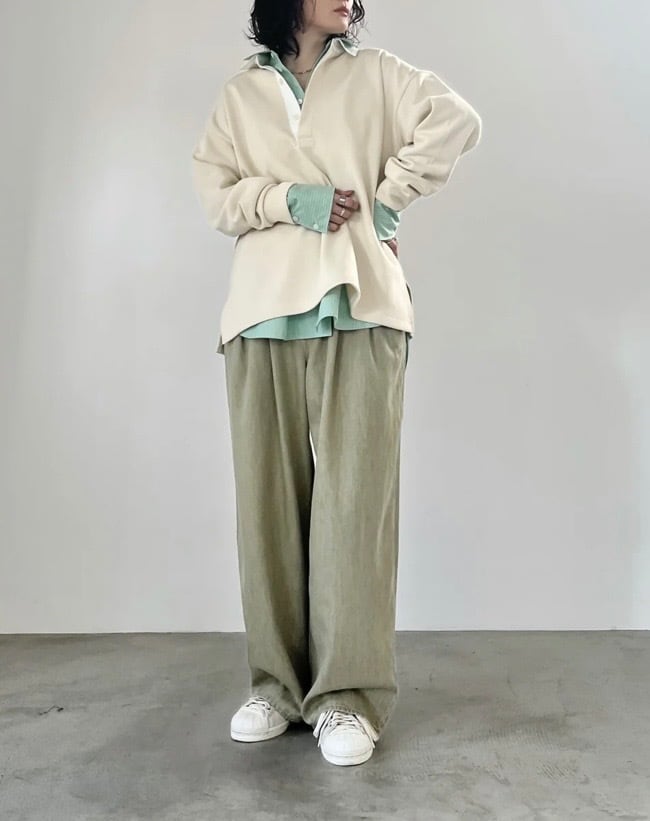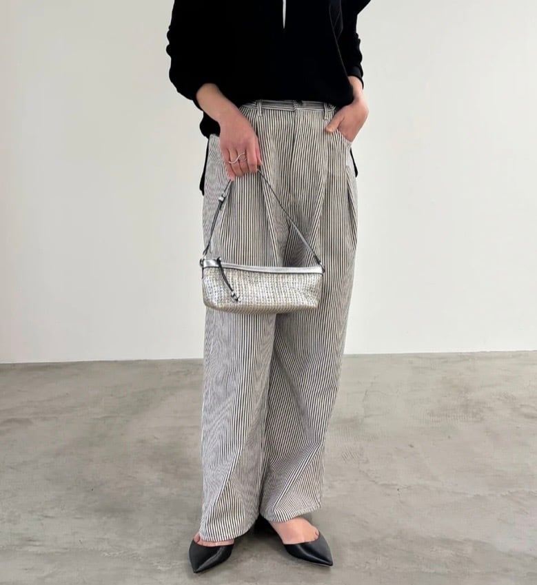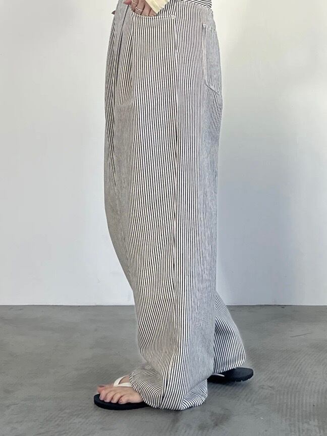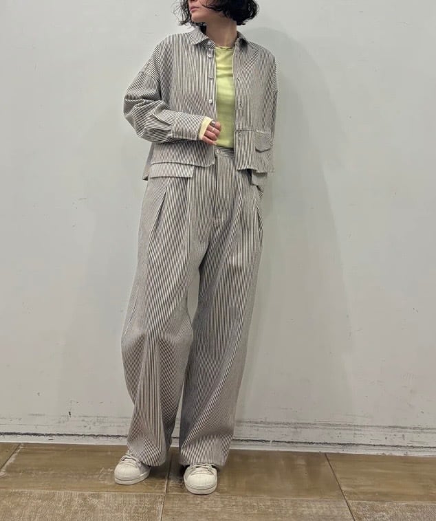 ライトオンスの綿デニムとヒッコリーに近い洗い加工を施し、柔らかく仕上げたボリュームパンツ。フロントの2タックでヒップ周りはゆとりがあり、ウエストは釦でサイズ調整が出来るので、幅広いサイズの方に着用していただけます。同素材のシャツとセットアップもおすすめです。