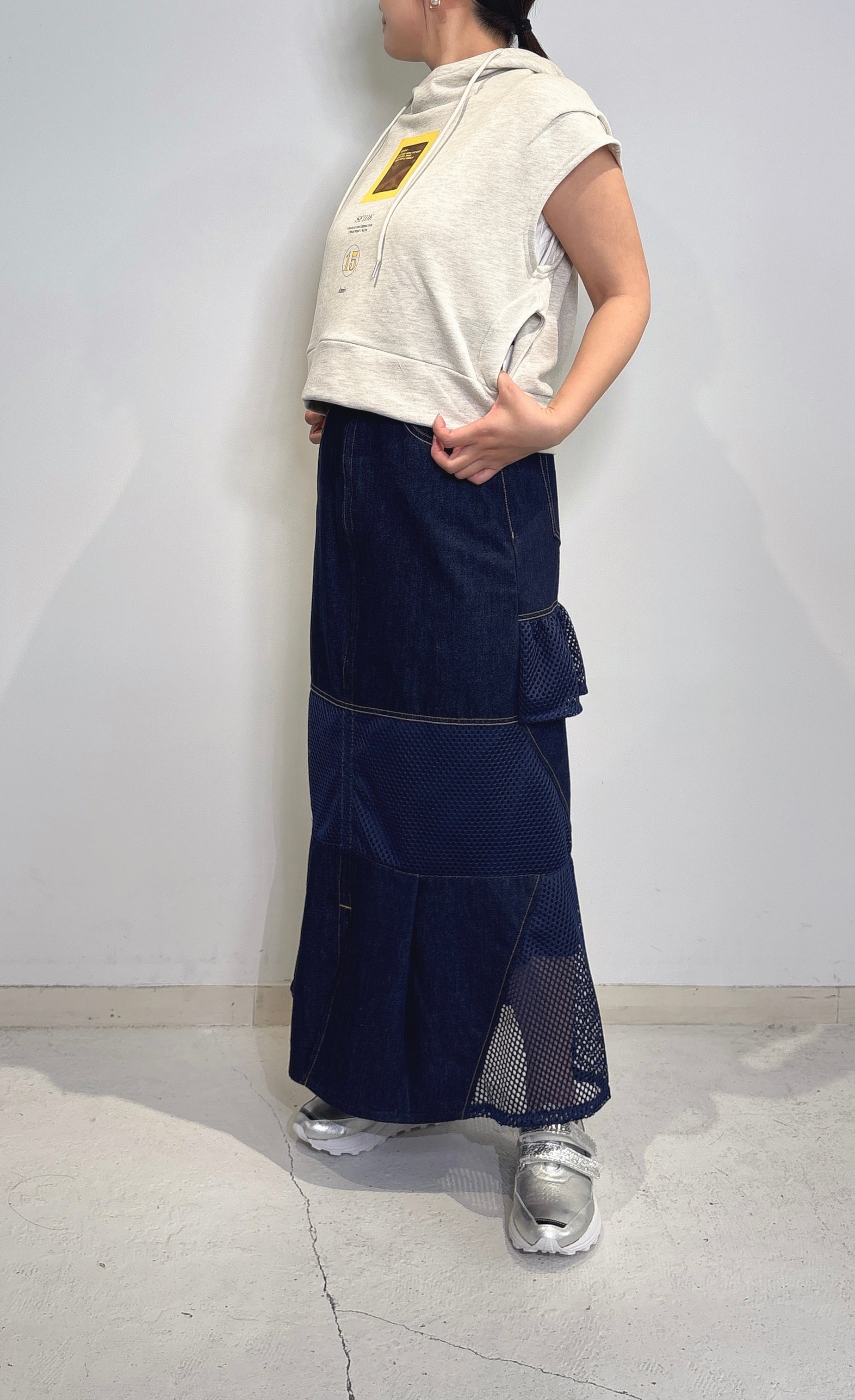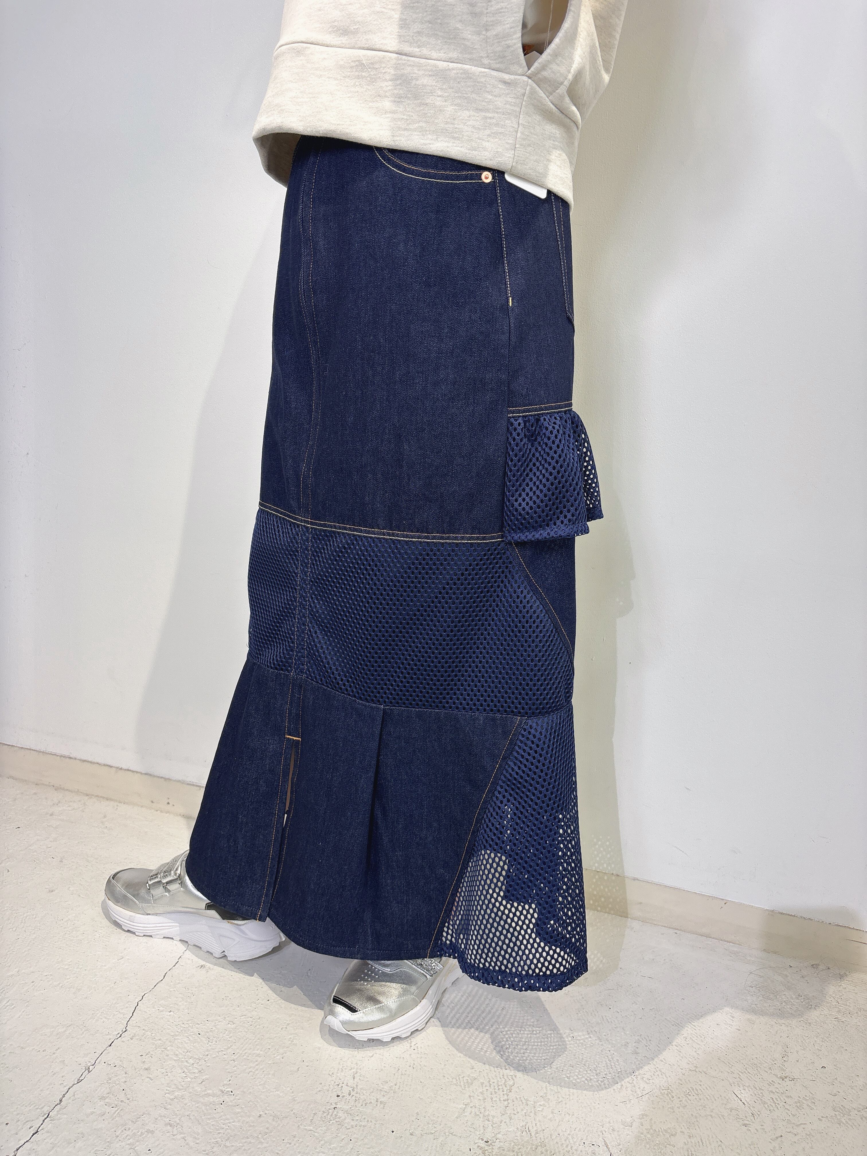 軽やかなメッシュ素材を取り入れたデザインのデニムスカート。デニムのしっかりとした素材感とメッシュの爽やかさが絶妙にミックスされており、春夏のお出かけにぴったり!