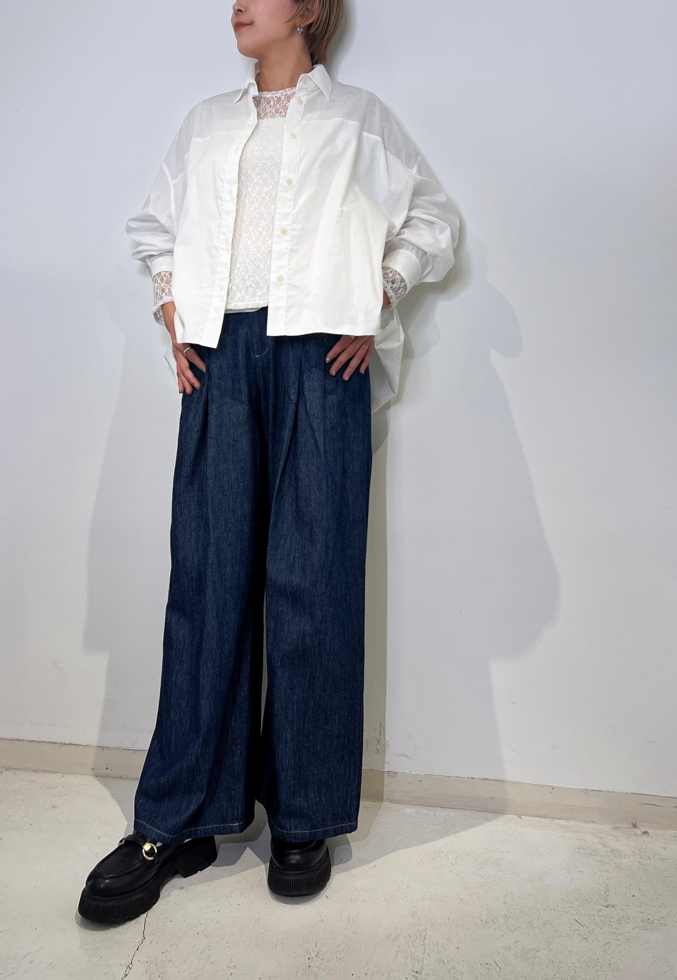 深く入ったタックは、体型をカバーしつつ、ワイドなシルエットながらスッキリとした印象を与えます。