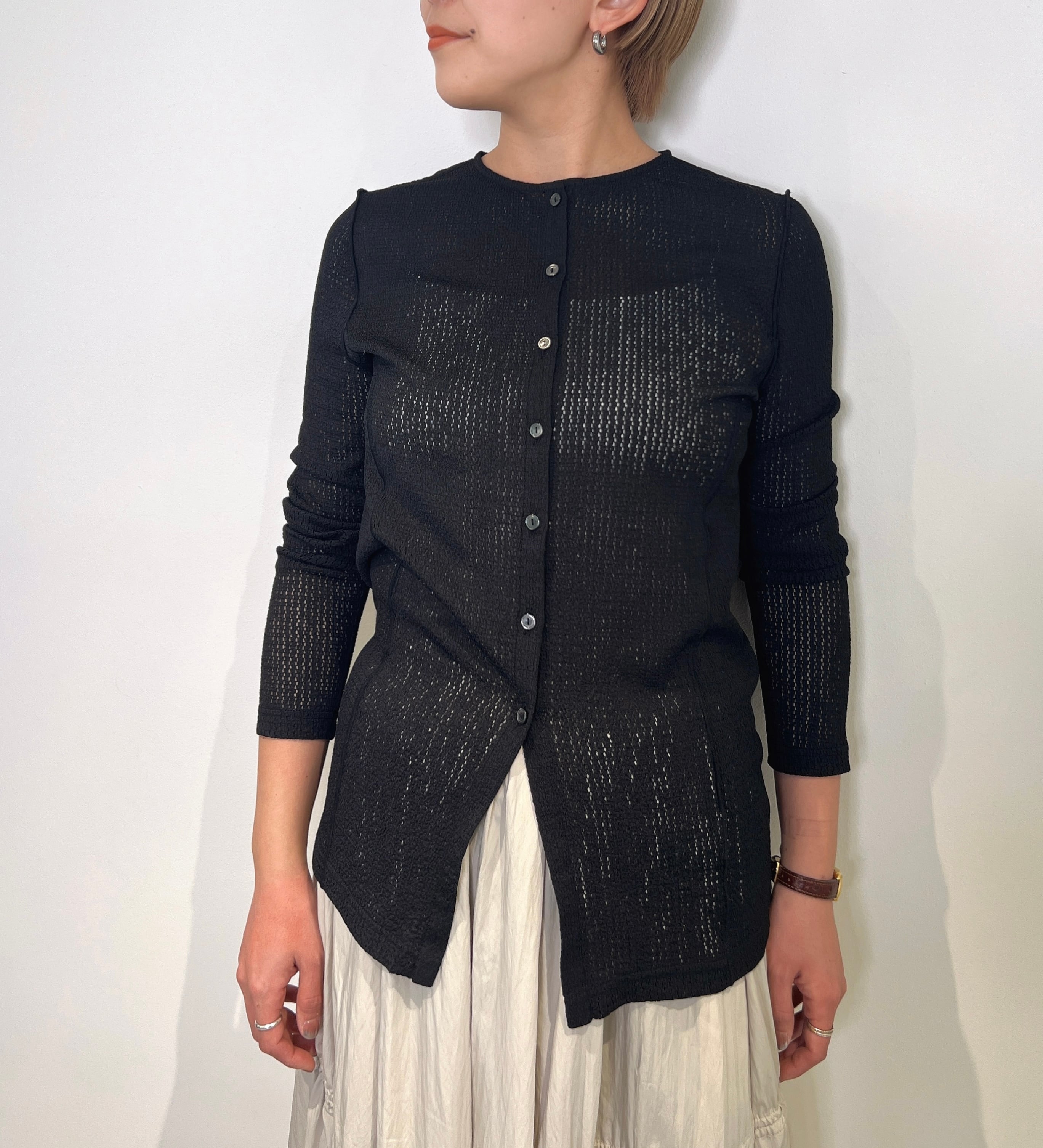 繊細なレース素材が上品な印象を演出するシアーカーディガンブラウス。軽やかな透け感があり、春夏シーズンの羽織りとしても活躍するアイテムです。