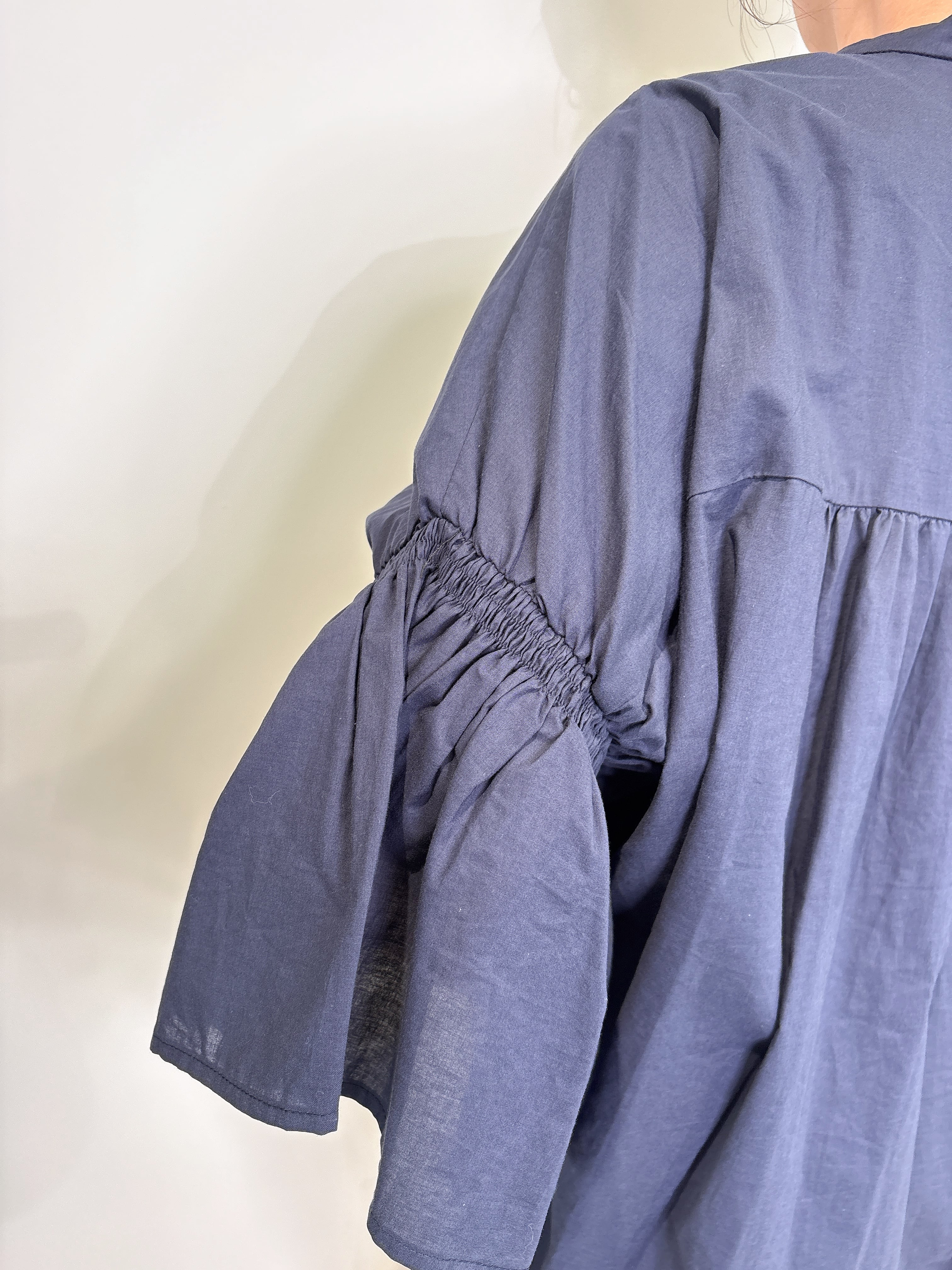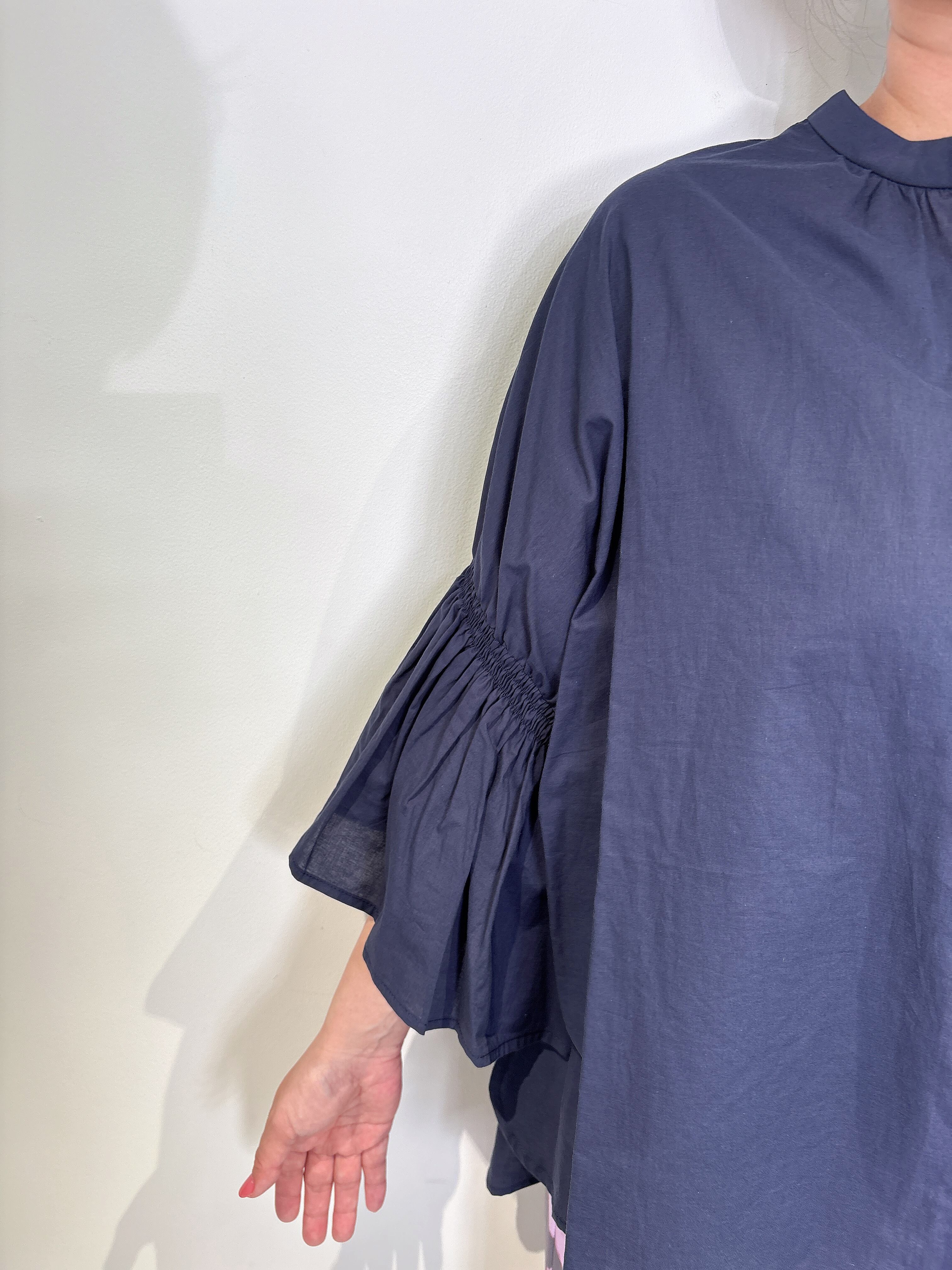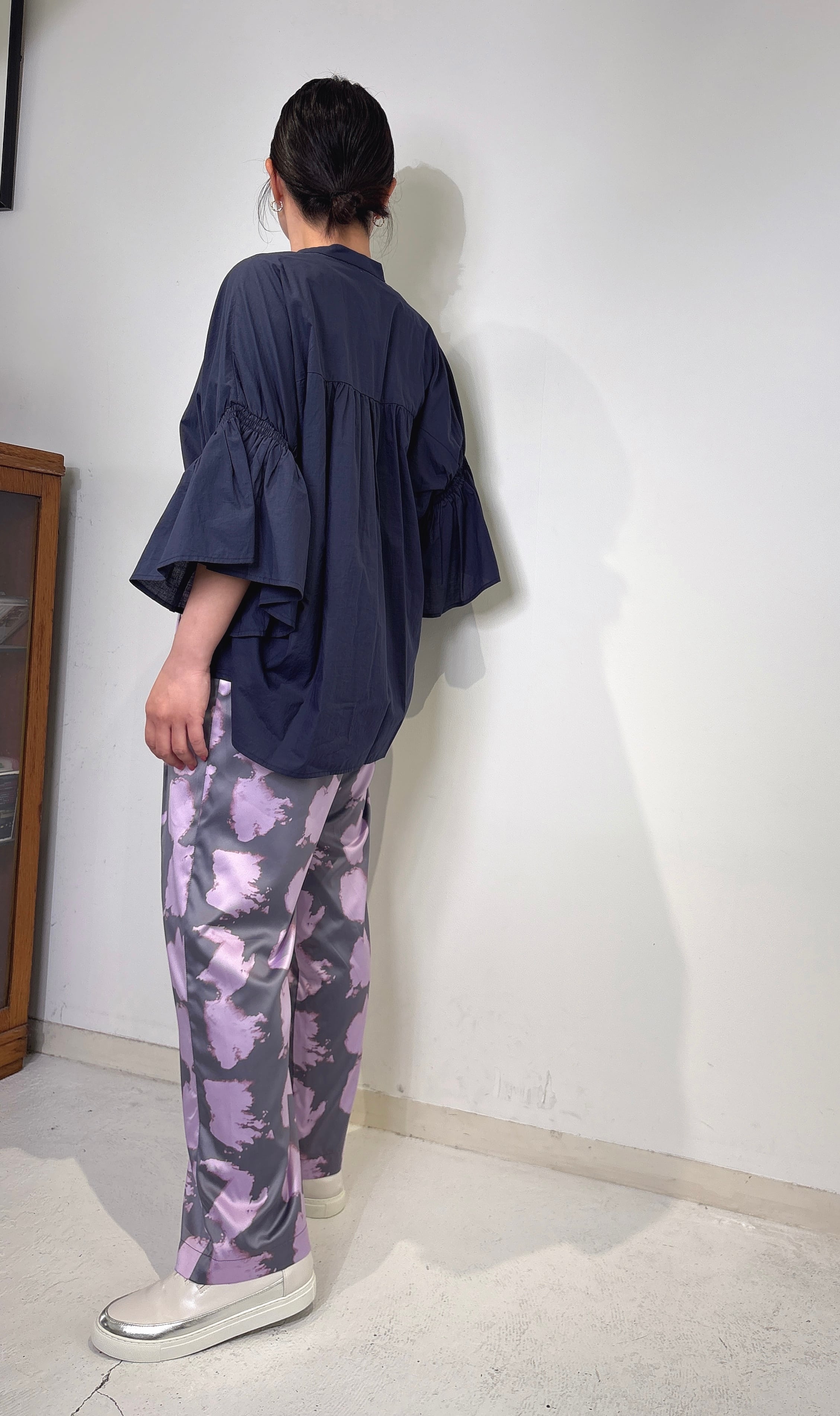 流れるようなボリュームスリーブデザインが、エレガントでありながらもリラックスした雰囲気を演出します。