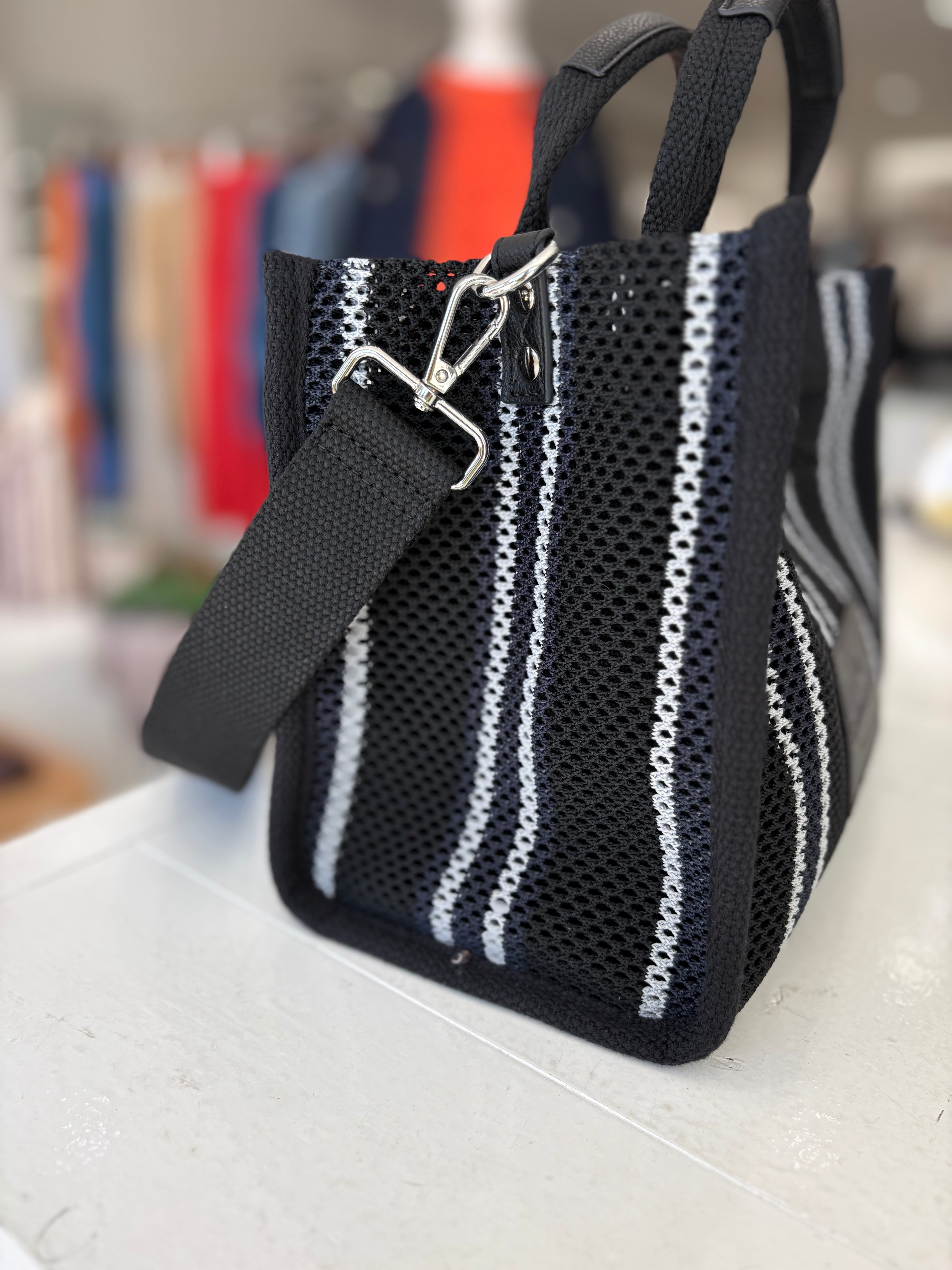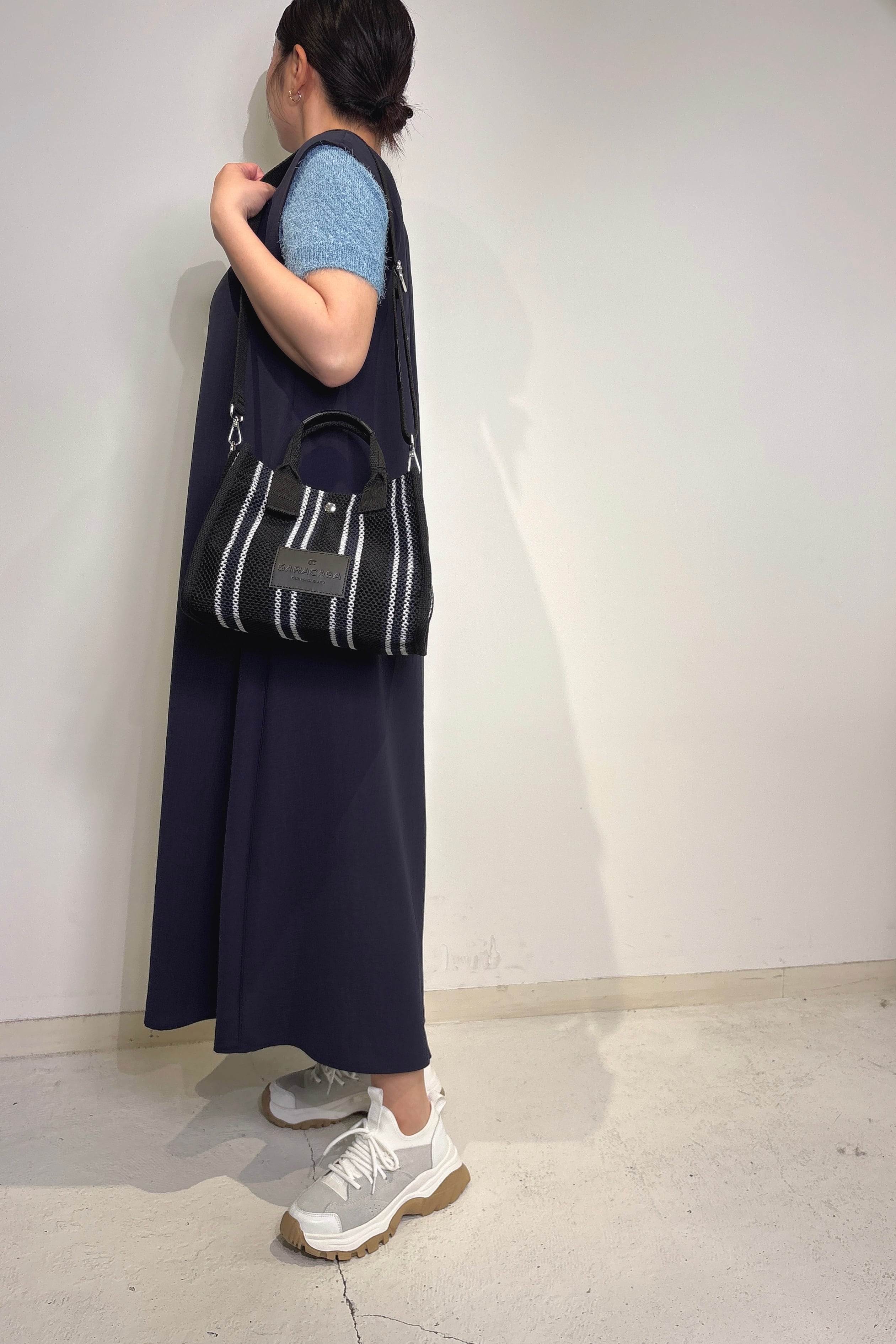 メッシュ素材と、モノトーンなストライプデザインが特徴で、通気性に優れたメッシュは、夏のお出かけにも最適で、軽量ながらしっかりとした作りが魅力です。
