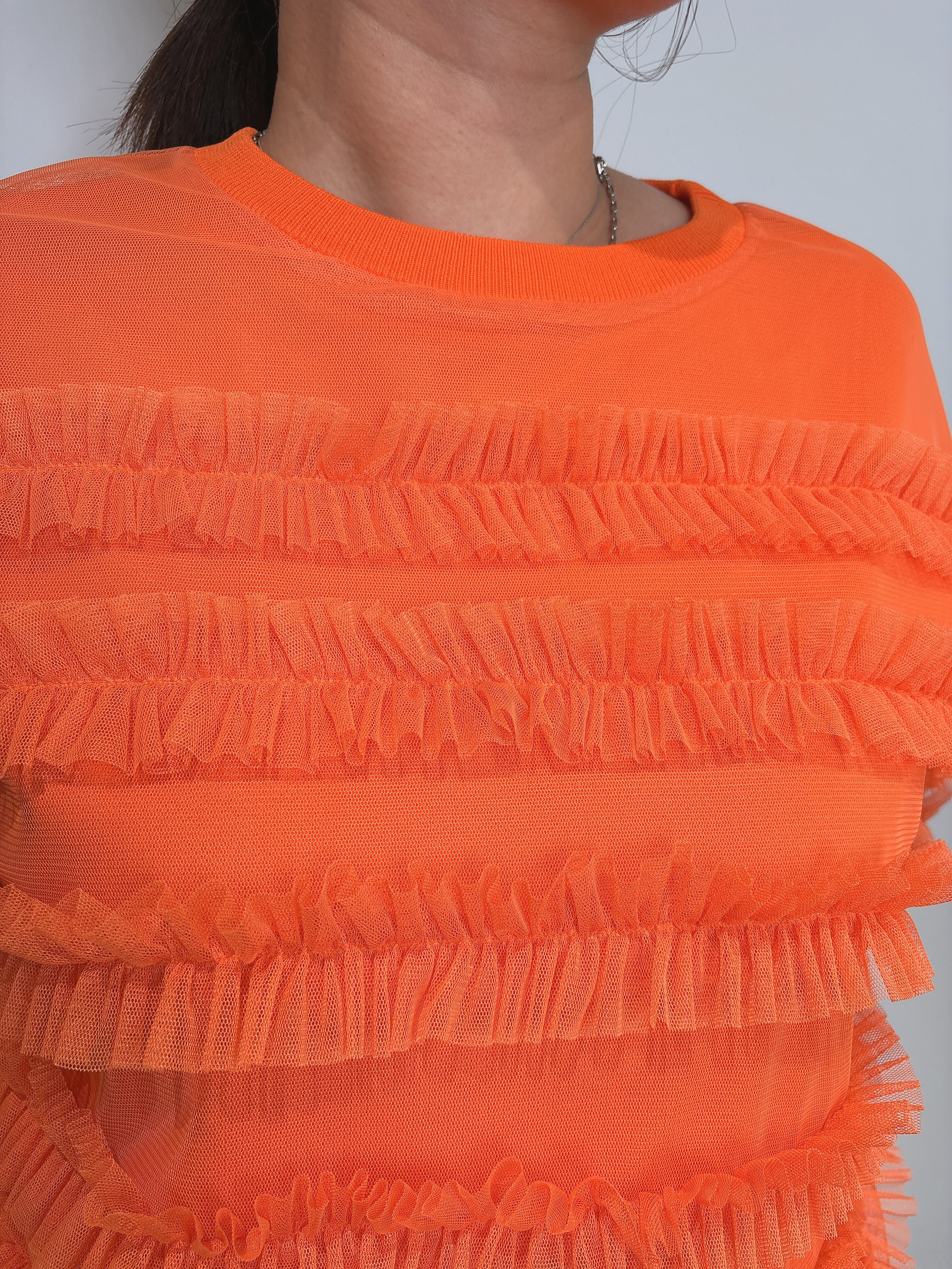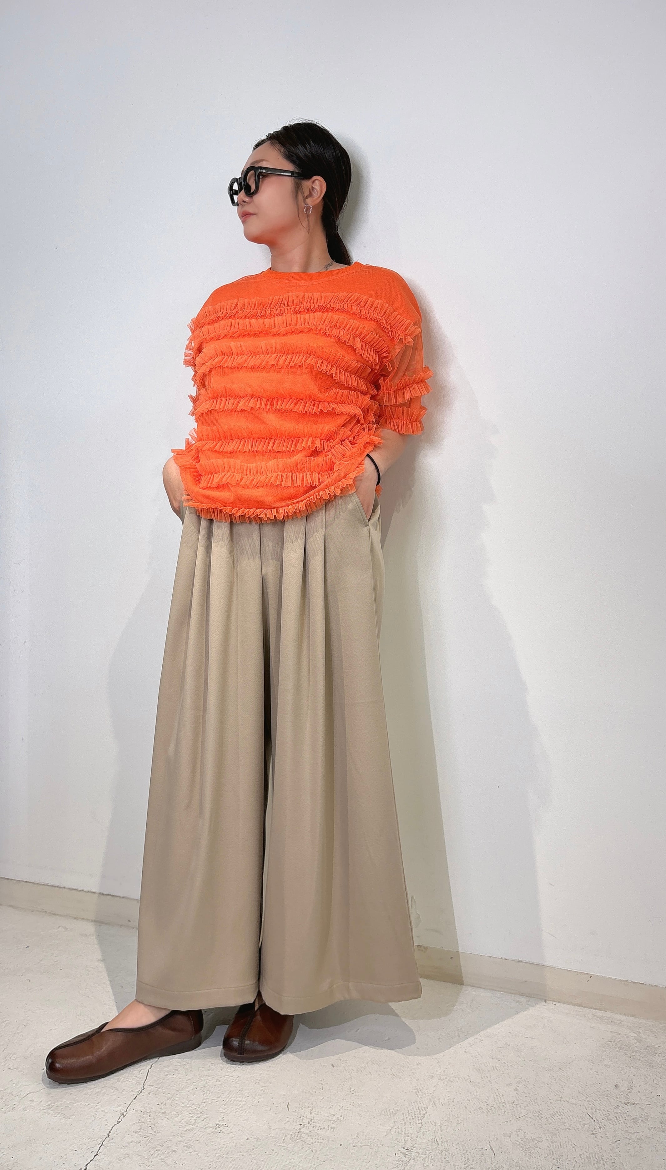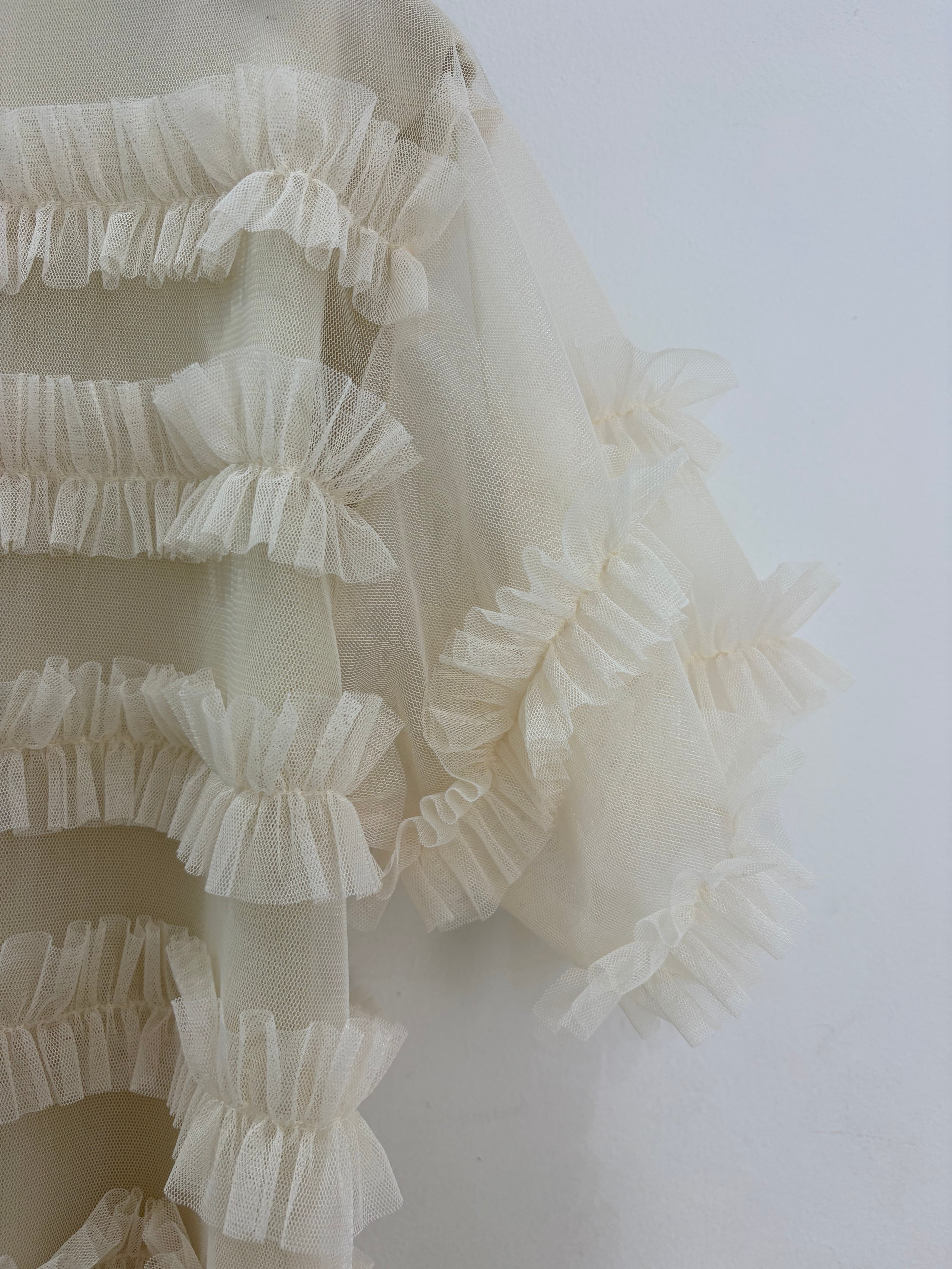 フェミニンな印象を与えるチュール素材を使用したフリルトップスで、軽やかさと華やかさを兼ね備えています。