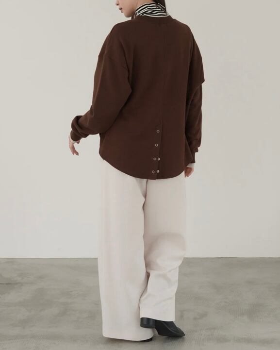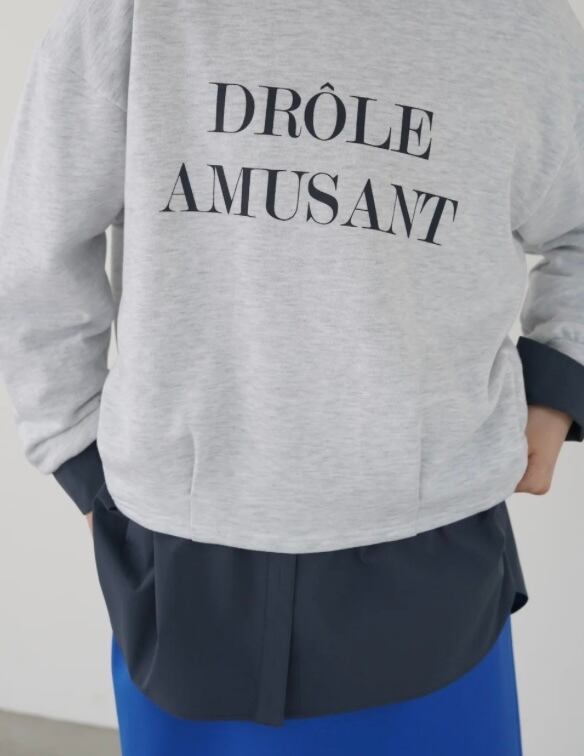 柔らかく通気性の良い、中肉のコットンスウェット。前身はタックをとり短めに設定し、自然にタックインしたようなシルエットに。後ろ身頃のドットボタンを開閉することにより着膨れせずレイヤードが楽しめる、着まわしやすいスウェットです。クラシックなムードのバイカラーロゴをプリントしました。
