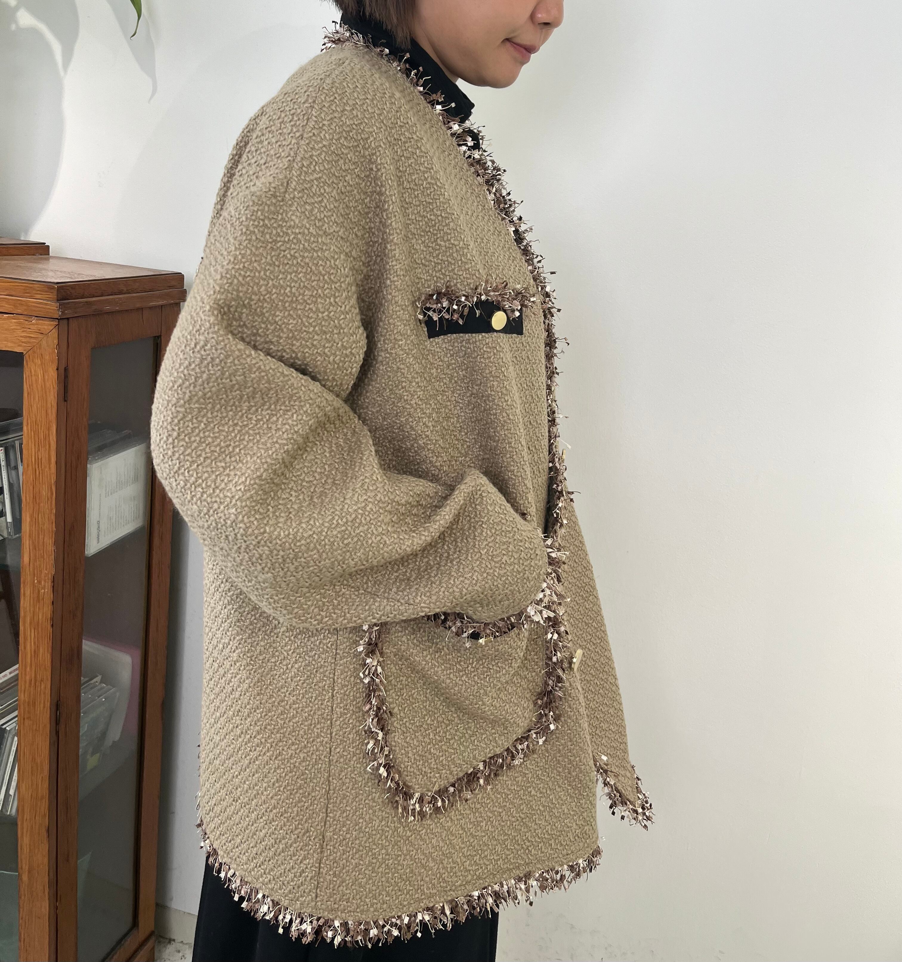 クラシックなツイード生地にフリンジ加工がポイントのショートコート。